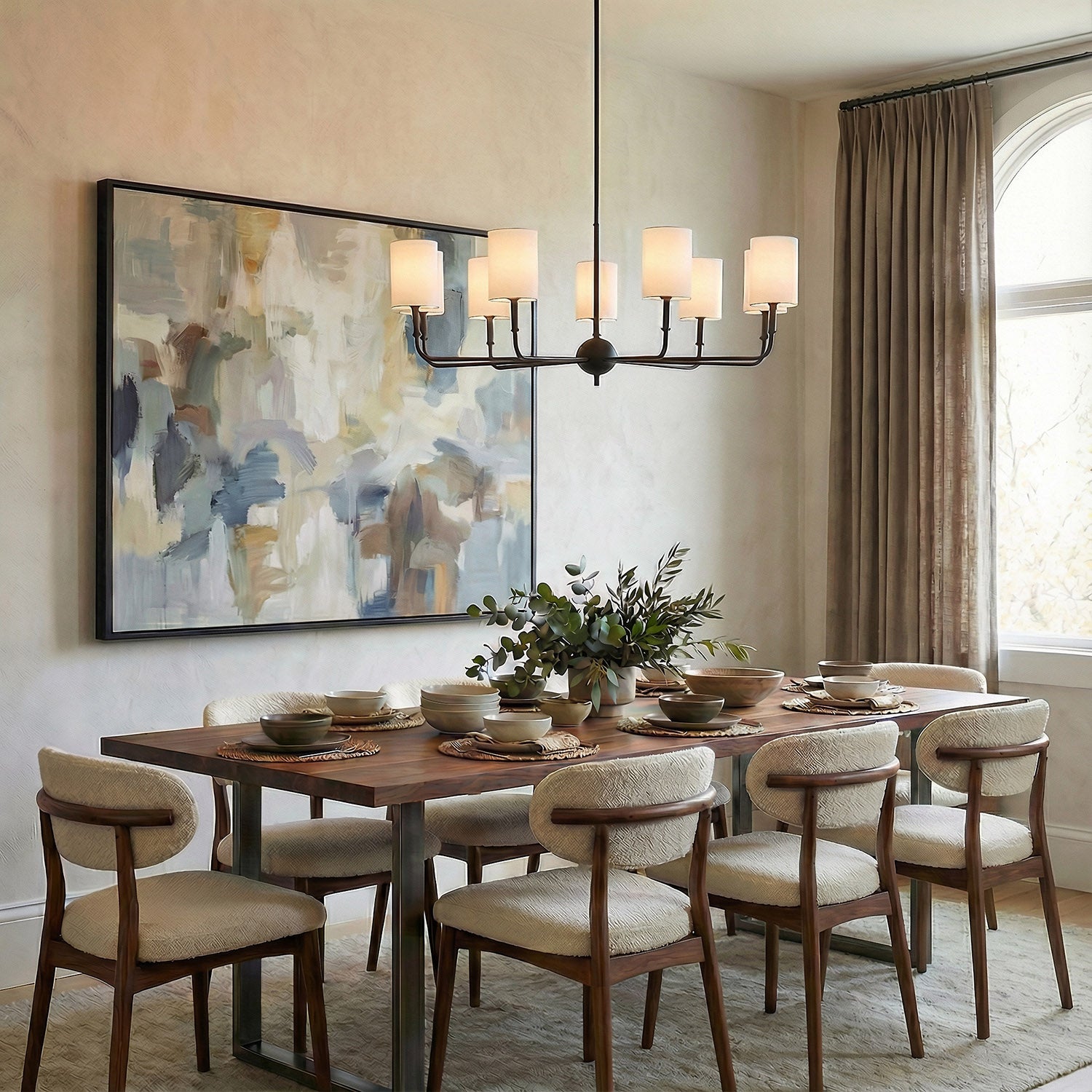 • Nine white linen shades provide soft, diffused illumination for a warm, inviting glow