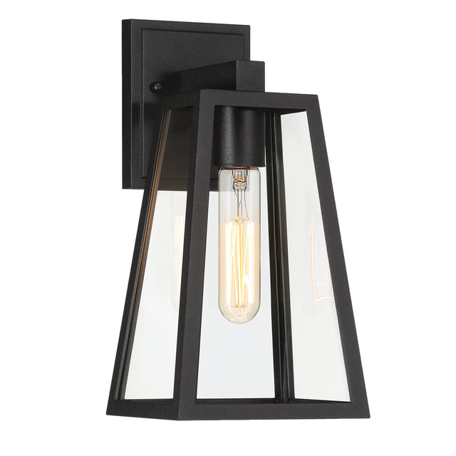 • Small wall light is 12.5" tall and features a single bulb showcased in a boldly tapered matte black frame with clear glass panels