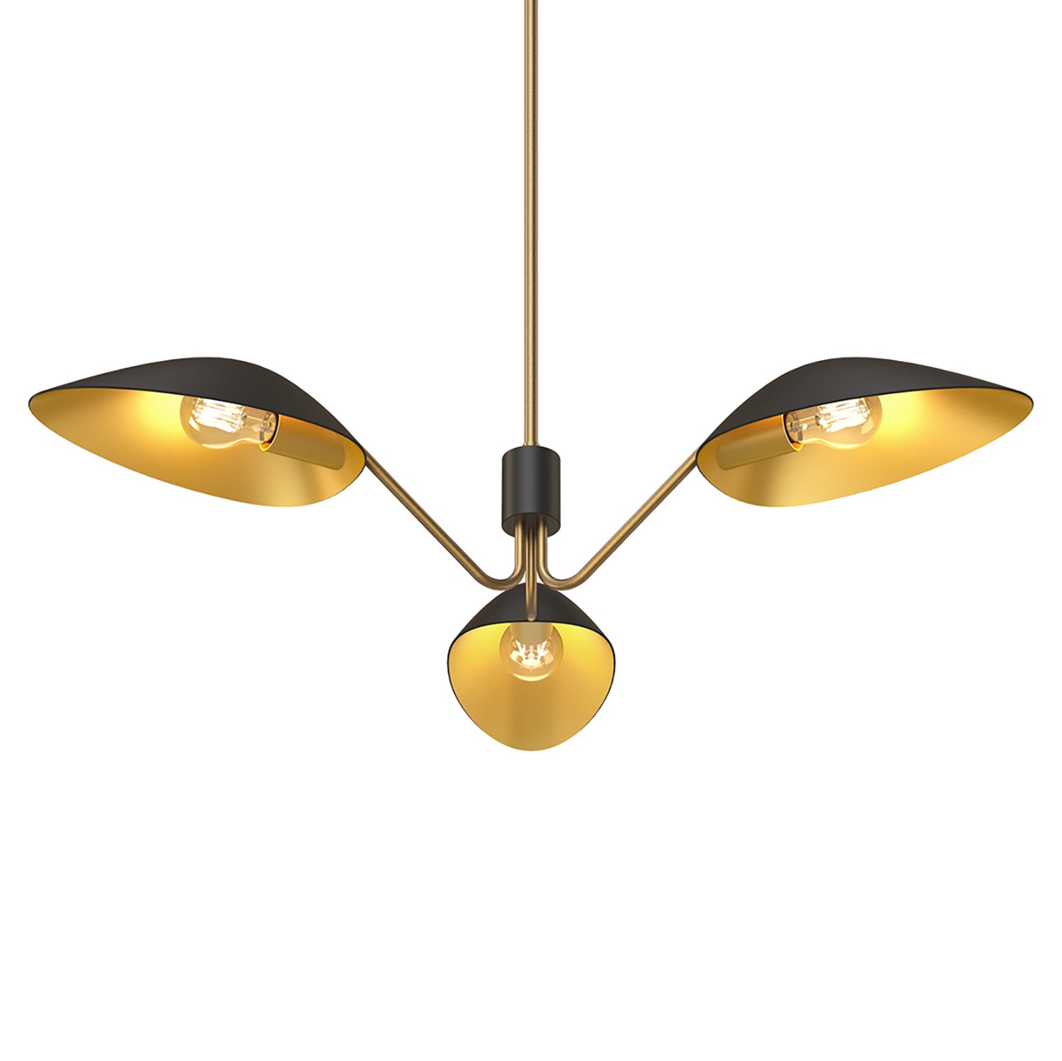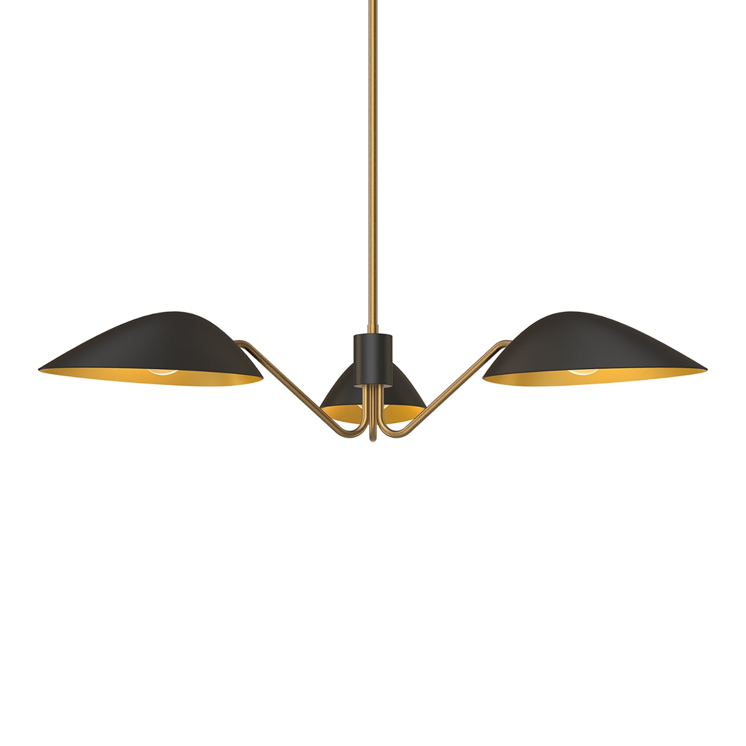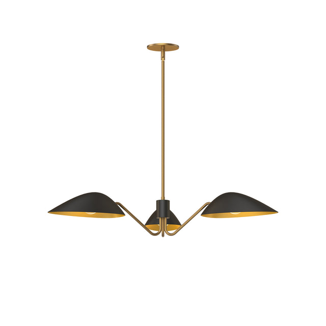 The Jade Chandelier makes a bold, modern statement with its distinctive and memorable 'mantis' design. This eye-catching fixture features three angular metal shades that extend outward from a central hub, creating a dynamic silhouette with an architectural presence. Each matte black shade has a contrasting antique brass interior that reflects light beautifully while directing illumination downward. The warm metallic tones continue through the angled arms, slim central column, and canopy, adding refined elegance to the contemporary form. With its substantial 36-inch spread, this chandelier commands attention over dining tables, kitchen islands, or in living spaces, offering a perfect blend of mid-century inspiration and current design trends.