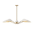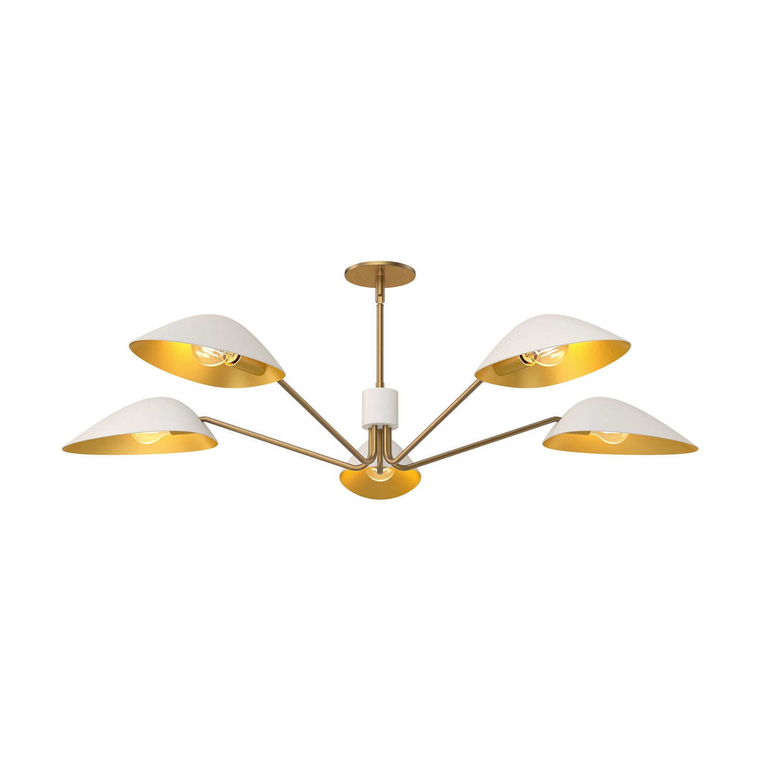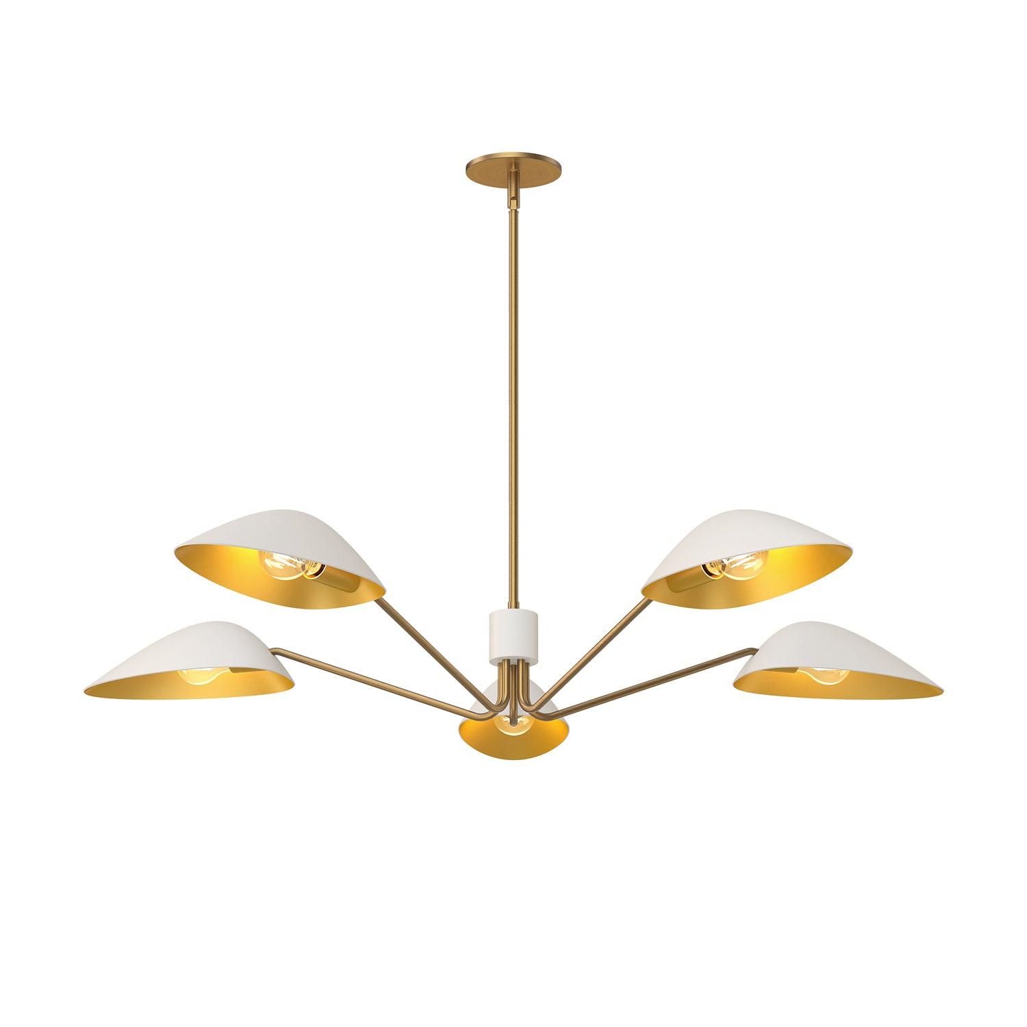 • Mantis-style chandelier features five arms and angular metal shades in crisp white with antique brass interiors and detailing