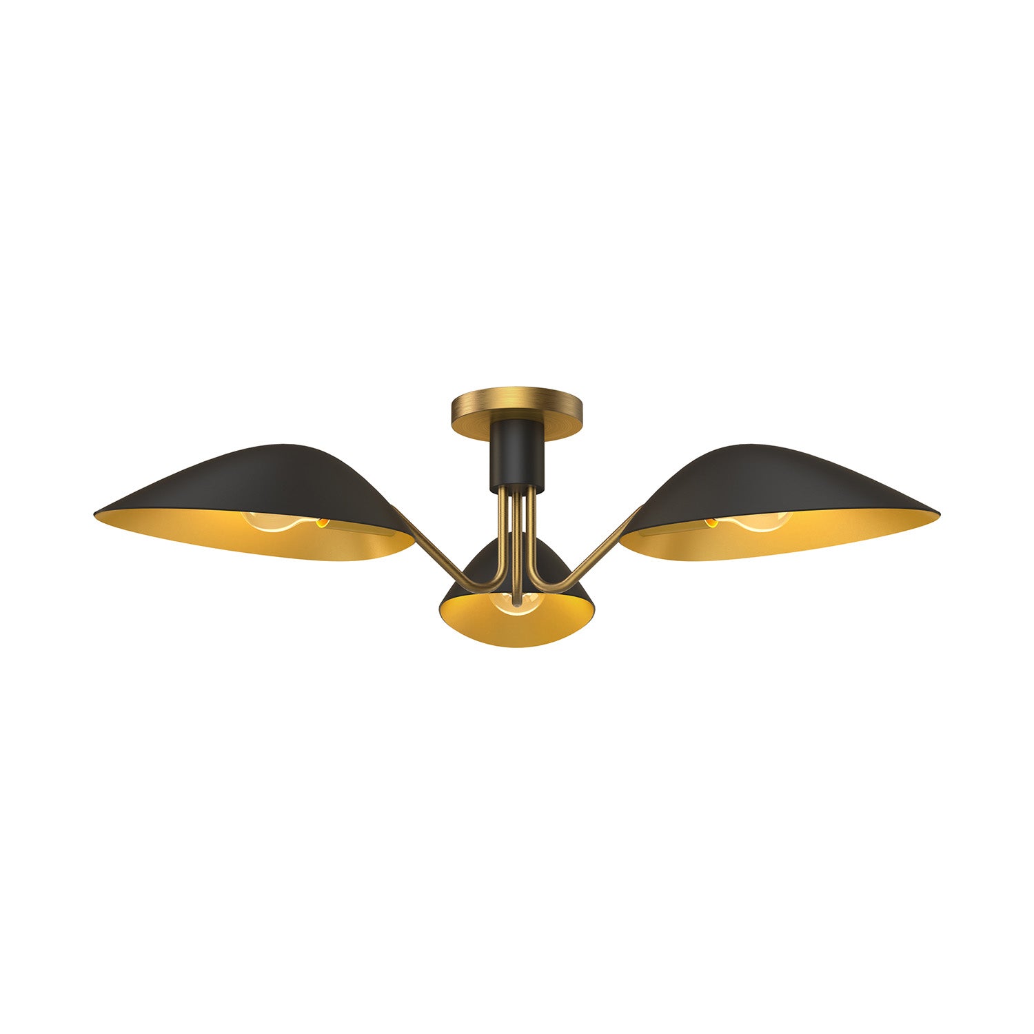 The Jade Semi-Flush Mount brings the collection's bold modern design to rooms with lower ceilings. This eye-catching 'mantis' inspired ceiling light features three angular metal shades that extend outward from a central hub, creating a dynamic silhouette with an architectural presence. Each matte black shade has a contrasting antique brass interior that reflects light beautifully while directing illumination downward. The warm metallic tones continue through the arms, central column and canopy, adding refined elegance to the contemporary form. With its substantial 32-inch spread, this ceiling fixture commands attention in dining rooms, kitchens, or living spaces, offering a perfect blend of mid-century inspiration and current design trends.