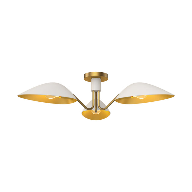 The Jade Semi-Flush Mount brings the collection's bold modern design to rooms with lower ceilings. This eye-catching 'mantis' inspired ceiling light features three angular metal shades that extend outward from a central hub, creating a dynamic silhouette with an architectural presence. Each crisp white shade has a contrasting antique brass interior that reflects light beautifully while directing illumination downward. The warm metallic tones continue through the arms, central column and canopy, adding refined elegance to the contemporary form. With its substantial 32-inch spread, this ceiling fixture commands attention in dining rooms, kitchens, or living spaces, offering a perfect blend of mid-century inspiration and current design trends.