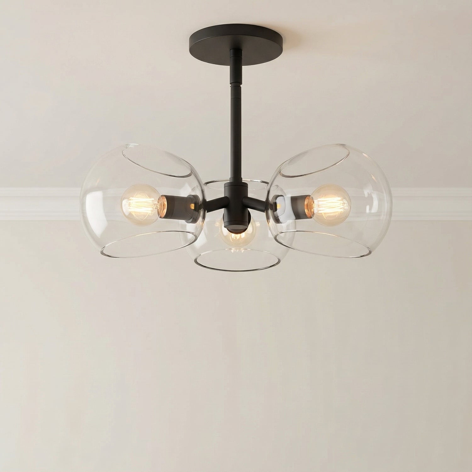 The Flynn 3 Light Pendant showcases a striking minimalist design where contemporary elegance meets functional artistry. This fixture features three clear glass orbs that appear to float around a central matte black frame, creating an airy, sculptural presence. Each transparent globe houses an exposed bulb, providing omnidirectional illumination that casts beautiful refractions and shadows. The bold contrast between the dark frame and crystal-clear glass creates a dramatic visual impact. Measuring a compact 16 inches in diameter, the Flynn pendant makes a bold statement without overwhelming the space. Its versatile aesthetic works beautifully in entryways, above kitchen islands, or as a dining room centerpiece, adding a touch of refined modern charm to any interior.