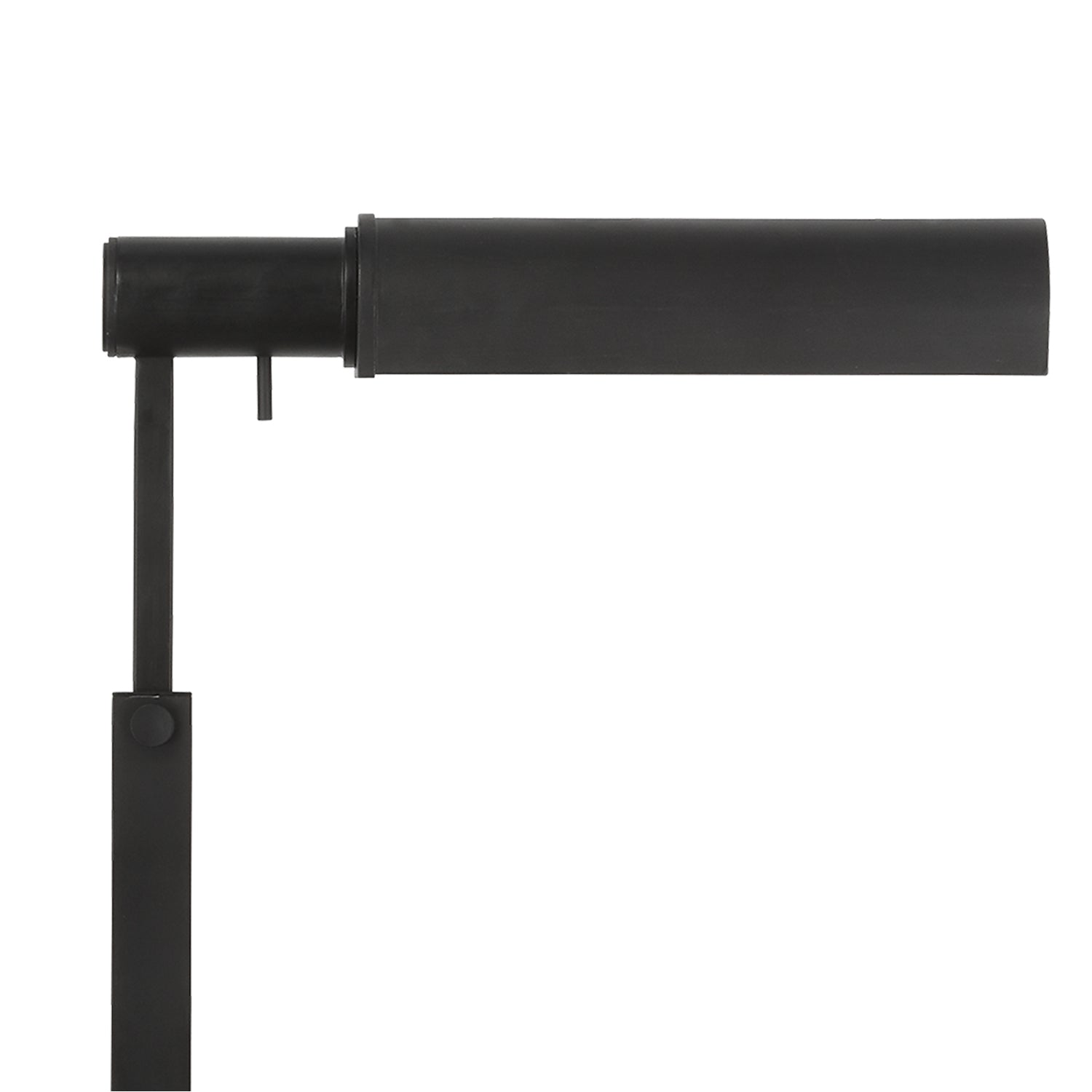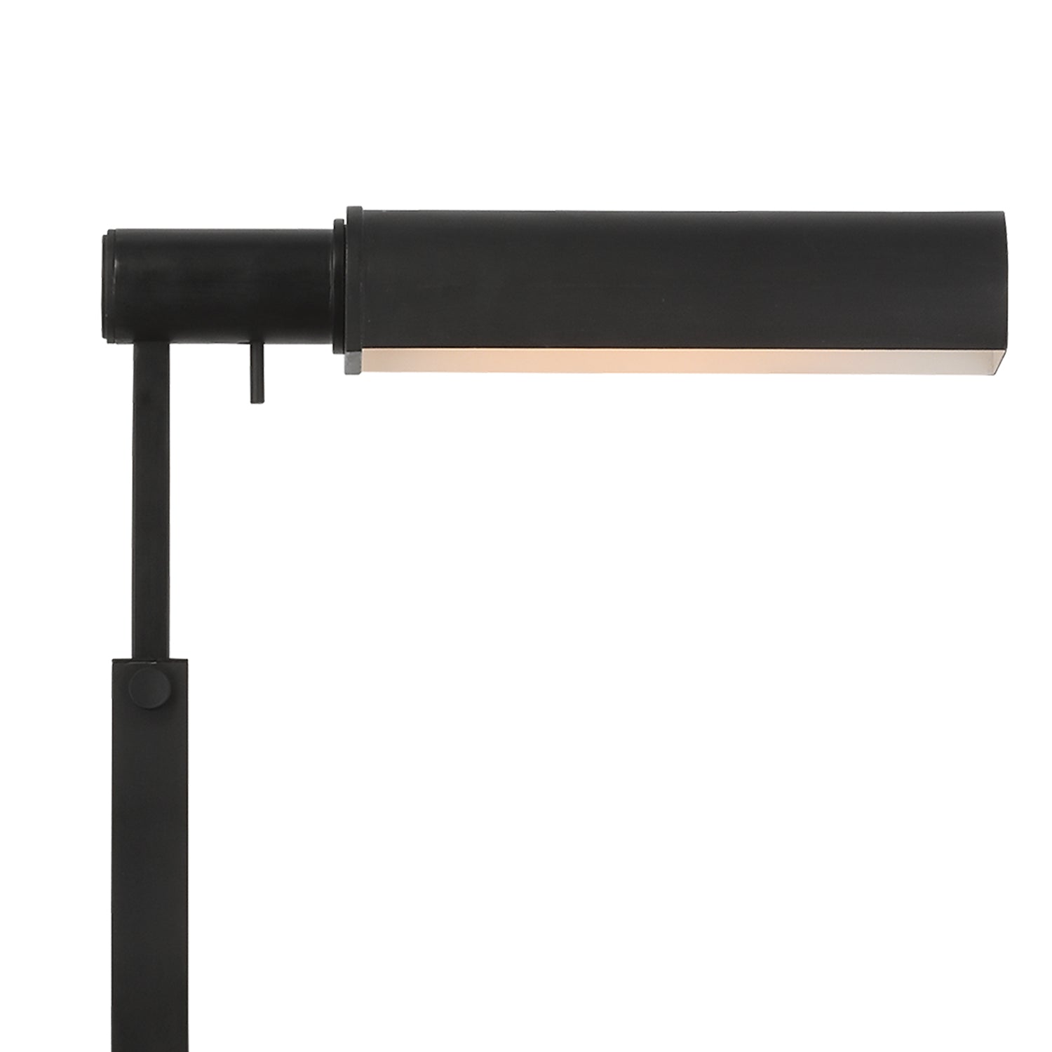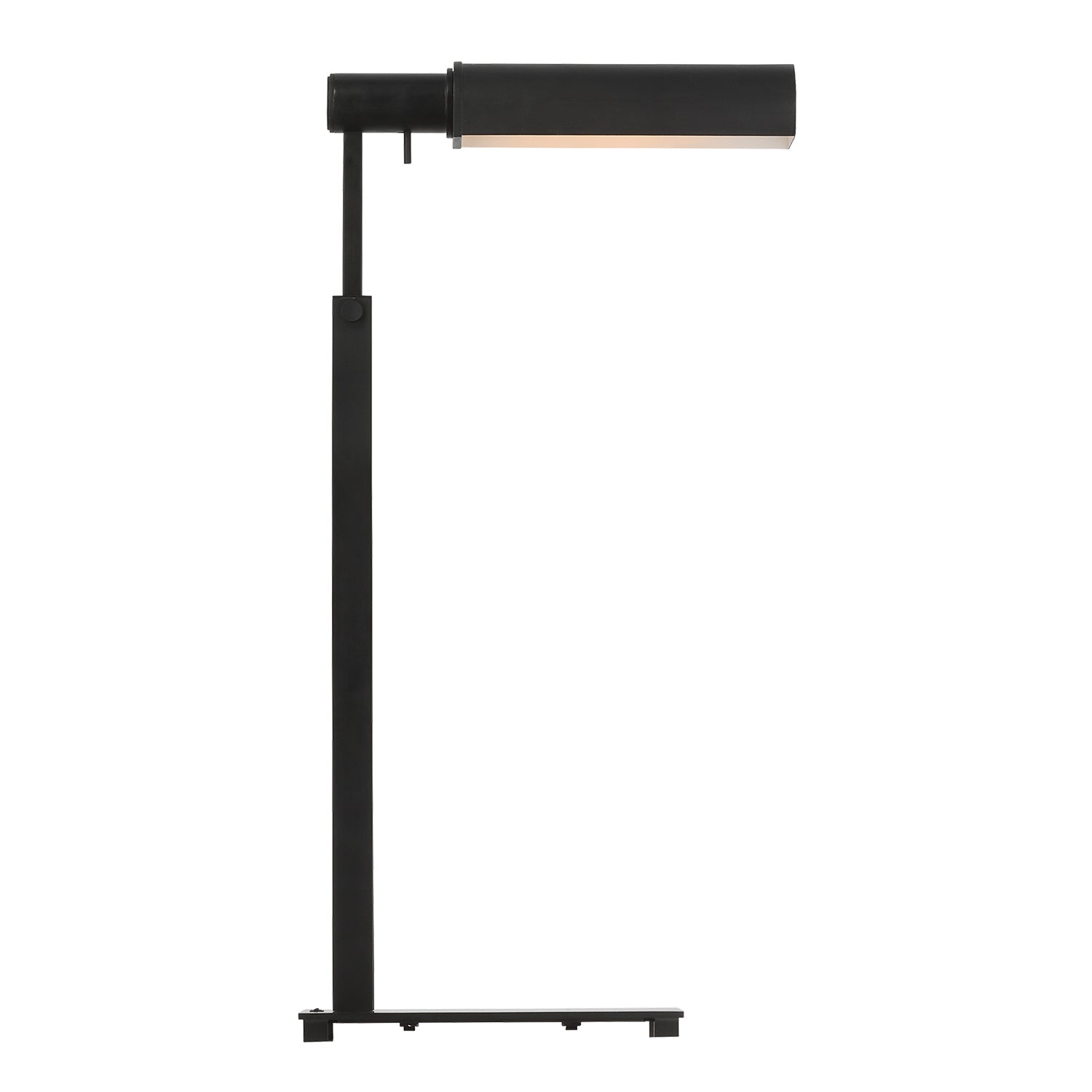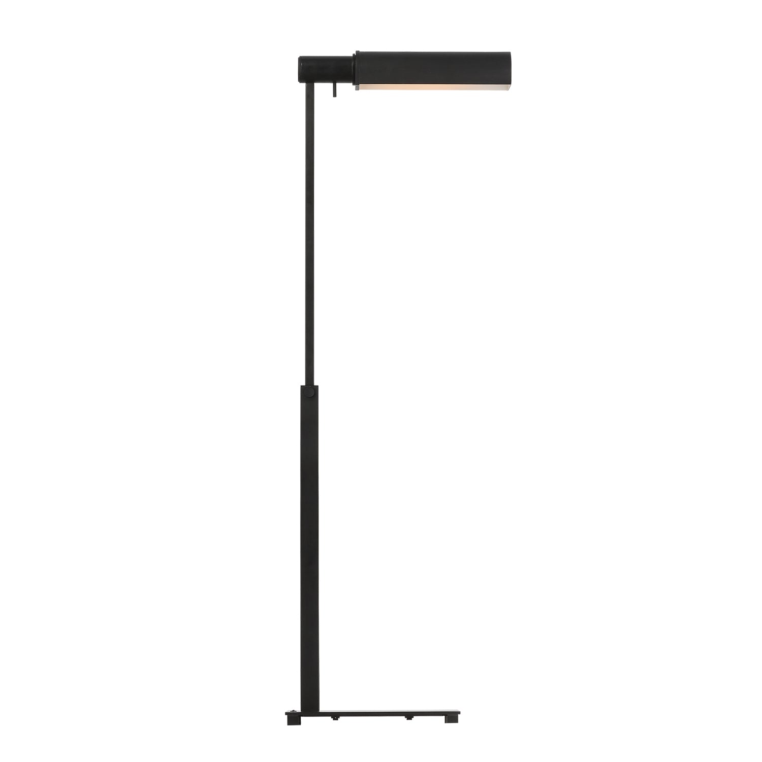 • Contemporary floor lamp with aged iron finish featuring clean architectural design for versatile lighting
