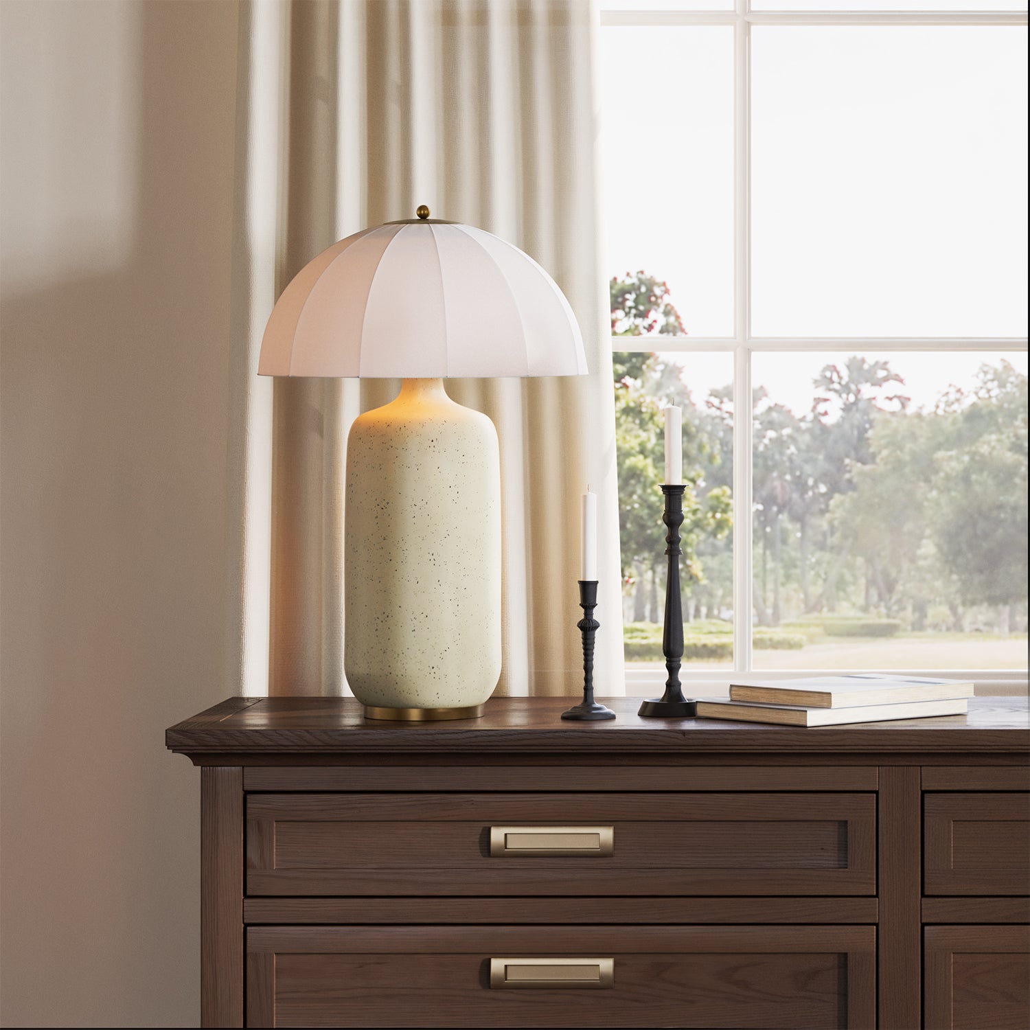 The Trudy Table Lamp brings elegant vintage charm to any room with its sophisticated parasol-inspired design. This stylish lamp features a distinctive speckled cream ceramic base with a gracefully curved fabric shade in soft white that diffuses light beautifully while creating a warm, inviting atmosphere. Brushed brass accents at the base and finial add subtle luxury and warmth to the design. The lamp's generous proportions and soft silhouette make it an ideal lighting solution for bedside tables, living room end tables, or entry consoles. With its timeless aesthetic and versatile neutral palette, the Trudy lamp complements both traditional and contemporary interiors while adding an element of refined style.
