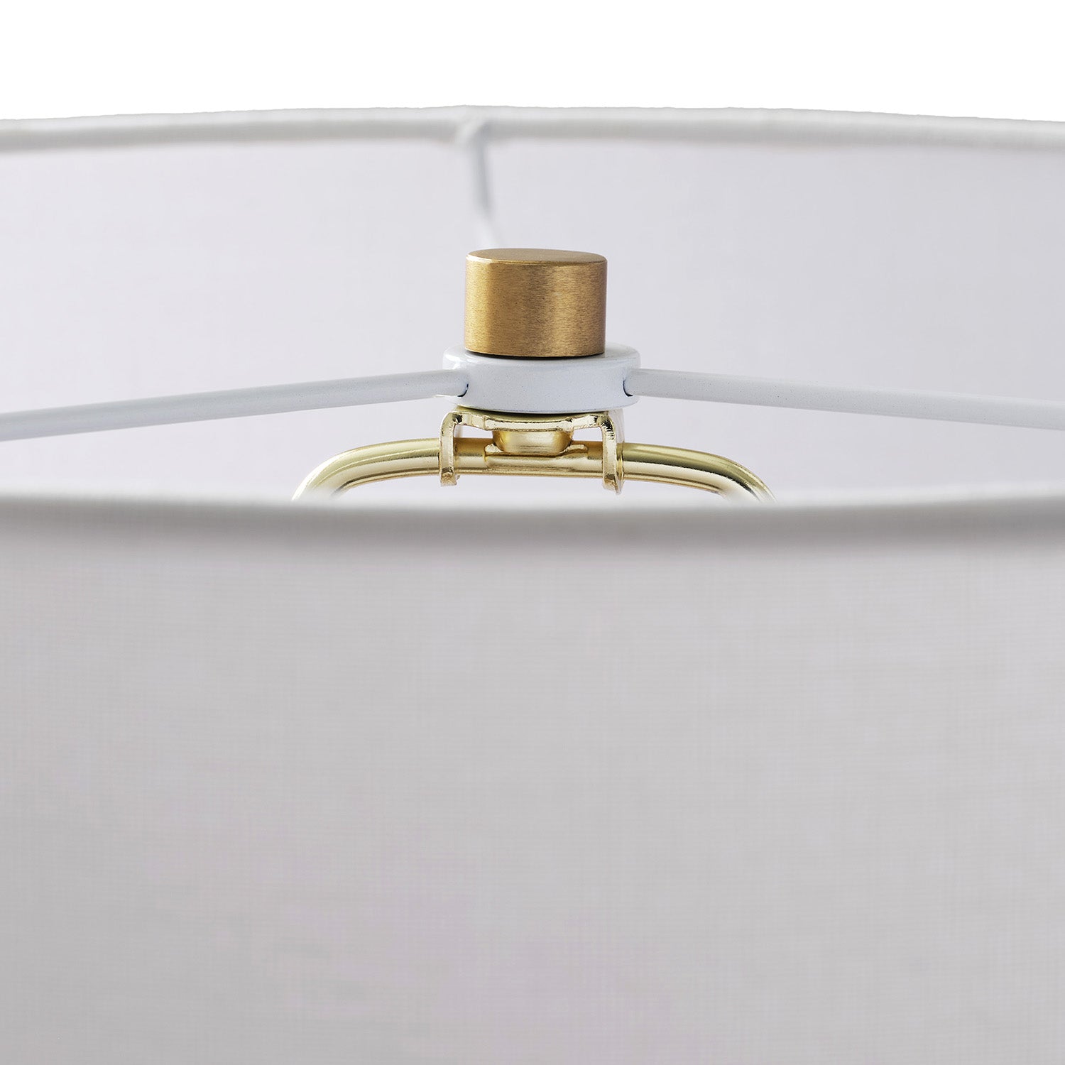 • Large sophisticated table lamp with gourd-shaped base, white linen drum shade, and aged brass hardware