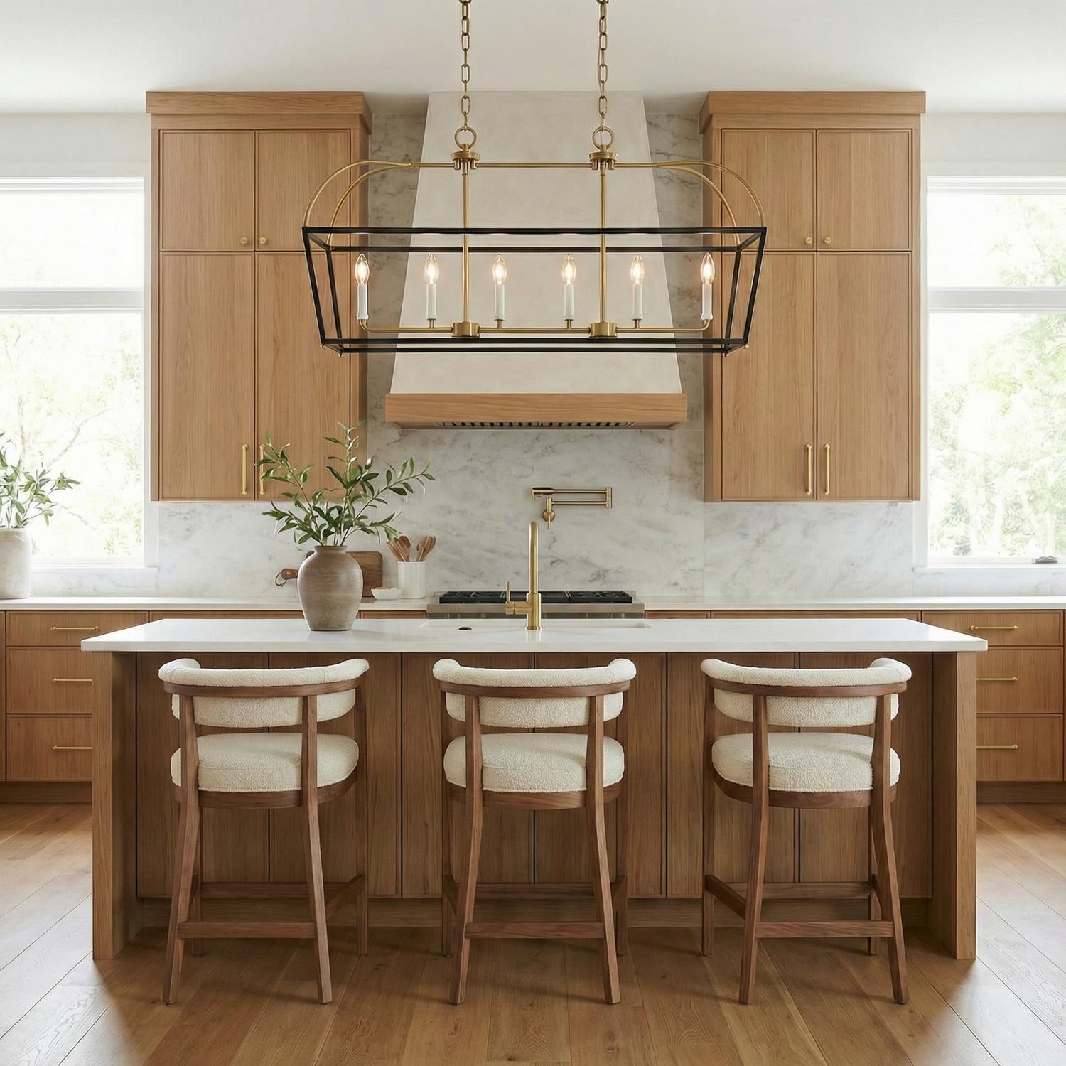 The Langford Linear Lantern Pendant 40" is a transitional linear chandelier that makes a sophisticated statement with its extended geometric frame and bold, two-toned finish. The tapered steel frame creates a long, airy silhouette, beautifully contrasted by the warm Satin Brass interior that highlights the exposed candelabra bulbs. This linear chandelier is thoughtfully designed to provide balanced, wide illumination, making it an ideal centerpiece over a dining table or kitchen island. With its ETL dry rating and sloped ceiling compatibility, it offers both functional beauty and versatile appeal. This striking transitional light fixture delivers enduring style and a perfect blend of elegance and simplicity.