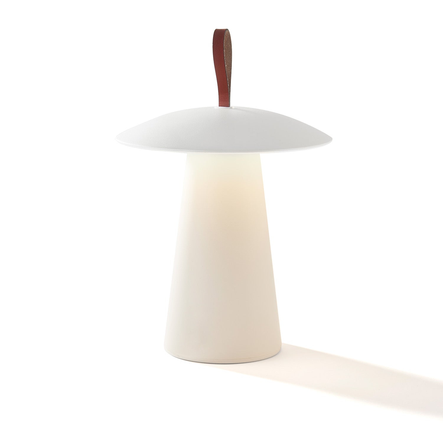 • This modern 11.5" tall portable table lamp has a powder-coated matte white finish, brown leather top handle, and an integrated LED light