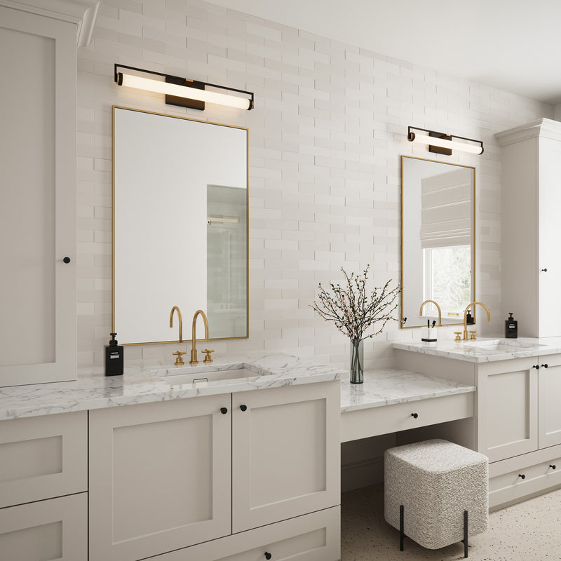 Our collection of LED bath bar lights combine sleek and stylish design with high-quality illumination for your bathroom vanity. Offered in distinct styles and multiple finishes, our bath bar vanity lights utilize an integrated LED board that provides energy-efficient and long-lasting lighting, with smooth, non-flickering, dimming capabilities and a 90+ CRI for “true to life” color accuracy. Their opal glass shades produce a soft, diffused light that prevents glare and harshness, perfect for daily tasks like applying make-up or shaving. Mount them horizontally above your vanity mirrors or install them vertically as beautiful side lights.