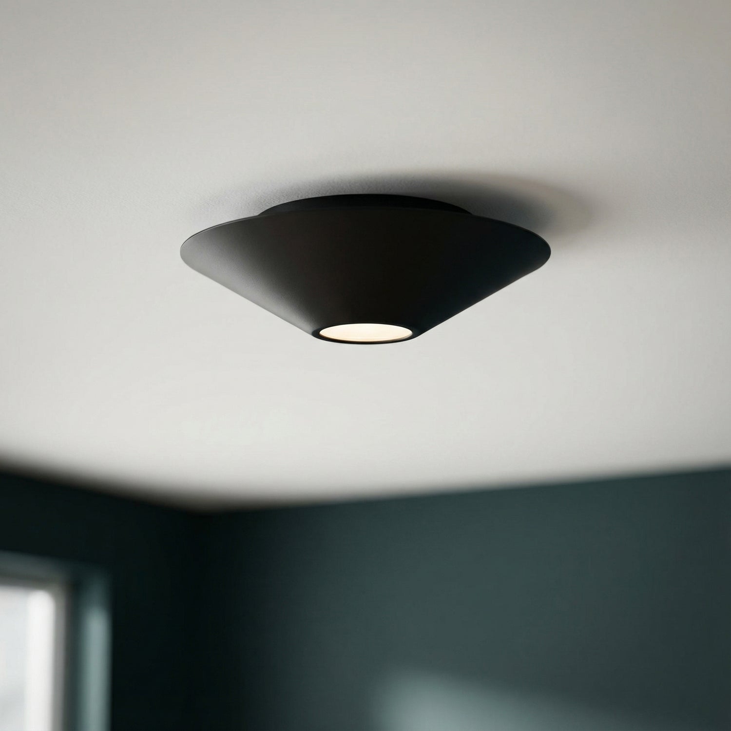 The Belvin LED Flush Mount features expertly crafted spun metal construction that creates a refined conical silhouette with clean, minimalist aesthetic throughout the space. This sophisticated 8" flush mount delivers innovative dual illumination with direct downlighting and gentle indirect light that washes upward from within the shade's interior, perfect for hallways, closets, bedrooms, bathrooms, and areas seeking refined overhead lighting with ADA-compliant design. The matte black finish creates bold contrast against the sleek conical form while integrated LED technology provides exceptional energy efficiency. Drawing inspiration from classic small-aperture fixtures while embracing contemporary design principles, this flush mount elevates any space with streamlined elegance and superior performance.