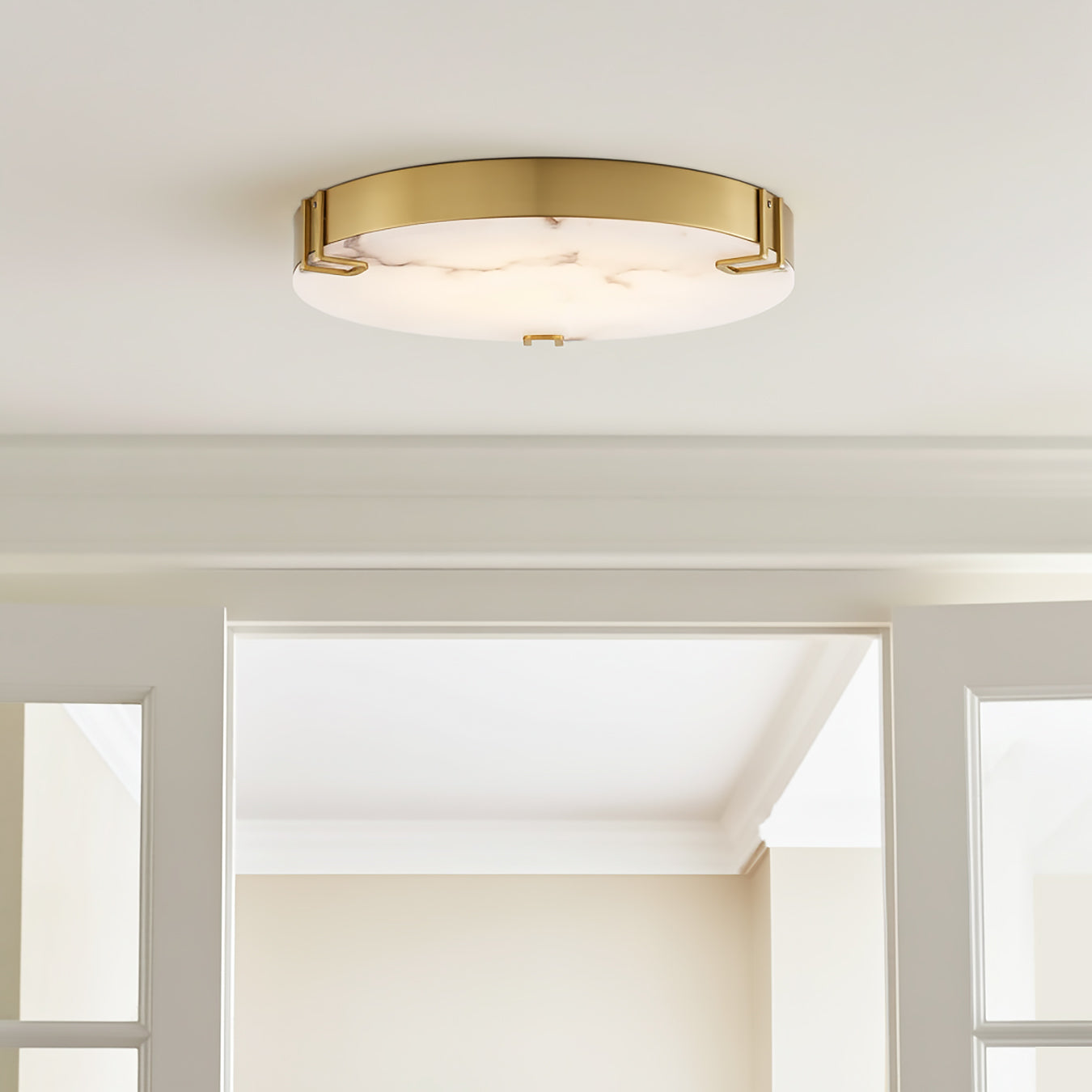 The Inez LED Flush Mount brings sophisticated warmth to any space with its striking alabaster stone design and warm brass finish. This captivating fixture features a beautifully crafted alabaster center, framed by a sleek brass rim, creating enhanced soft, even illumination perfect for bedrooms, hallways, or areas with lower ceilings. The brass and alabaster elements deliver contemporary luxury with refined elegance. At 22" in diameter with integrated LED technology, this flush mount makes a polished statement while providing decades of energy-efficient operation.