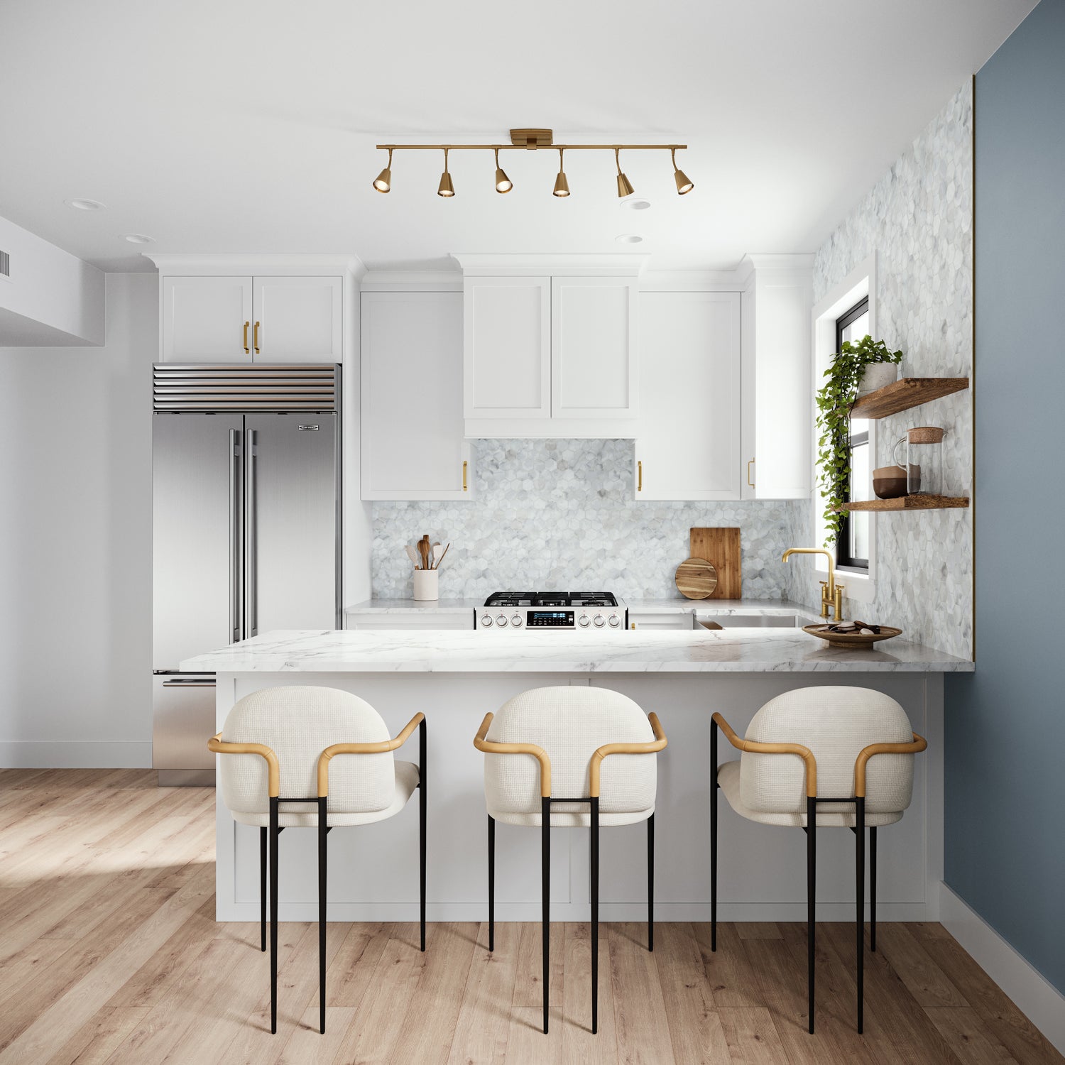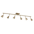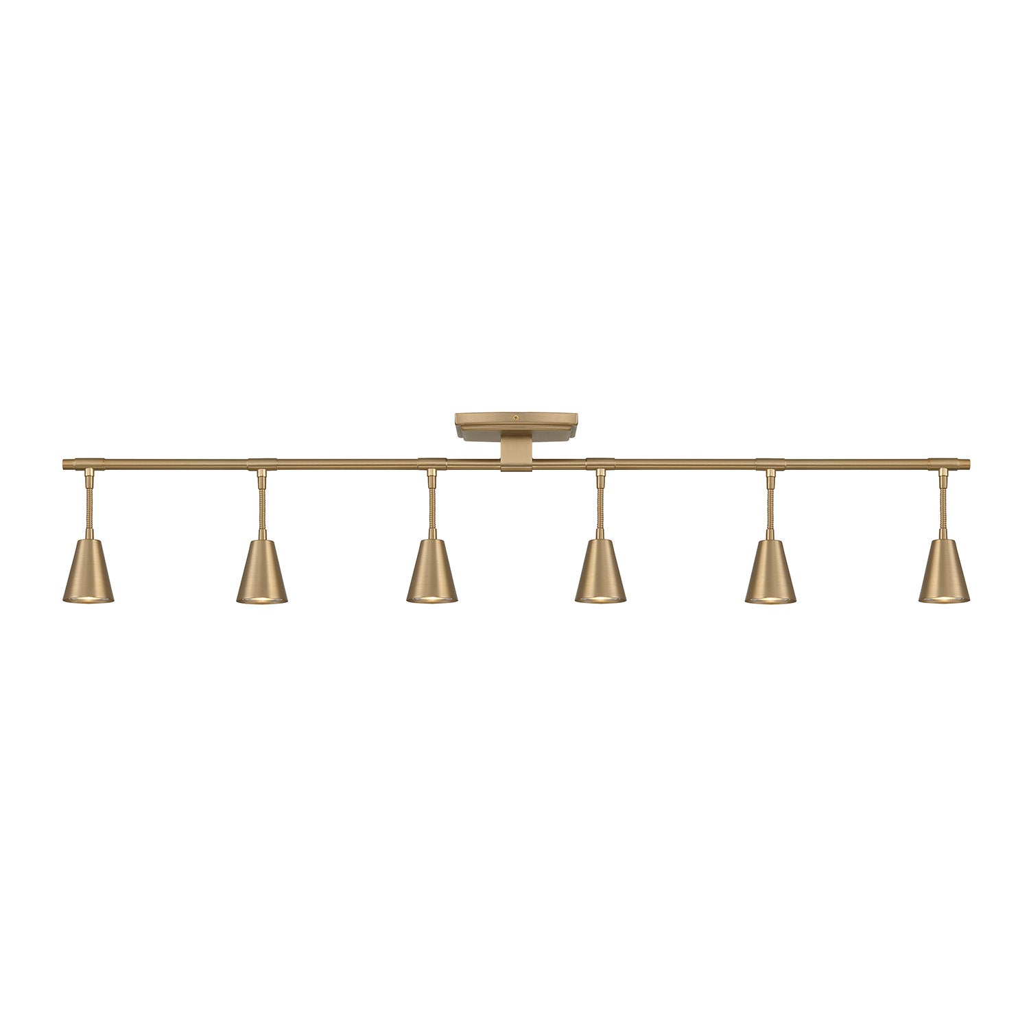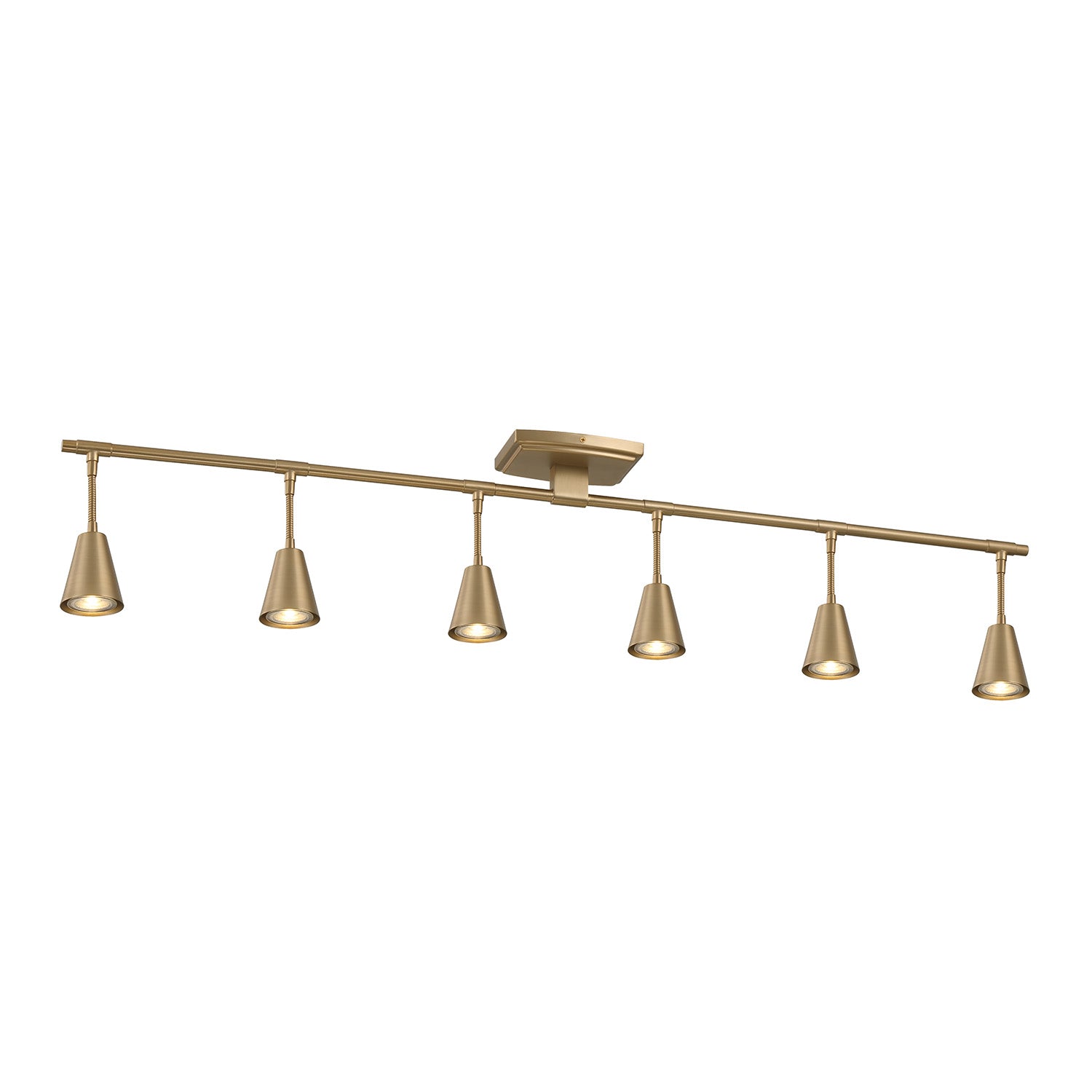 • One modern track light constructed of sturdy steel and finished in a luscious brushed brass, featuring six adjustable heads with swiveling necks for precision lighting