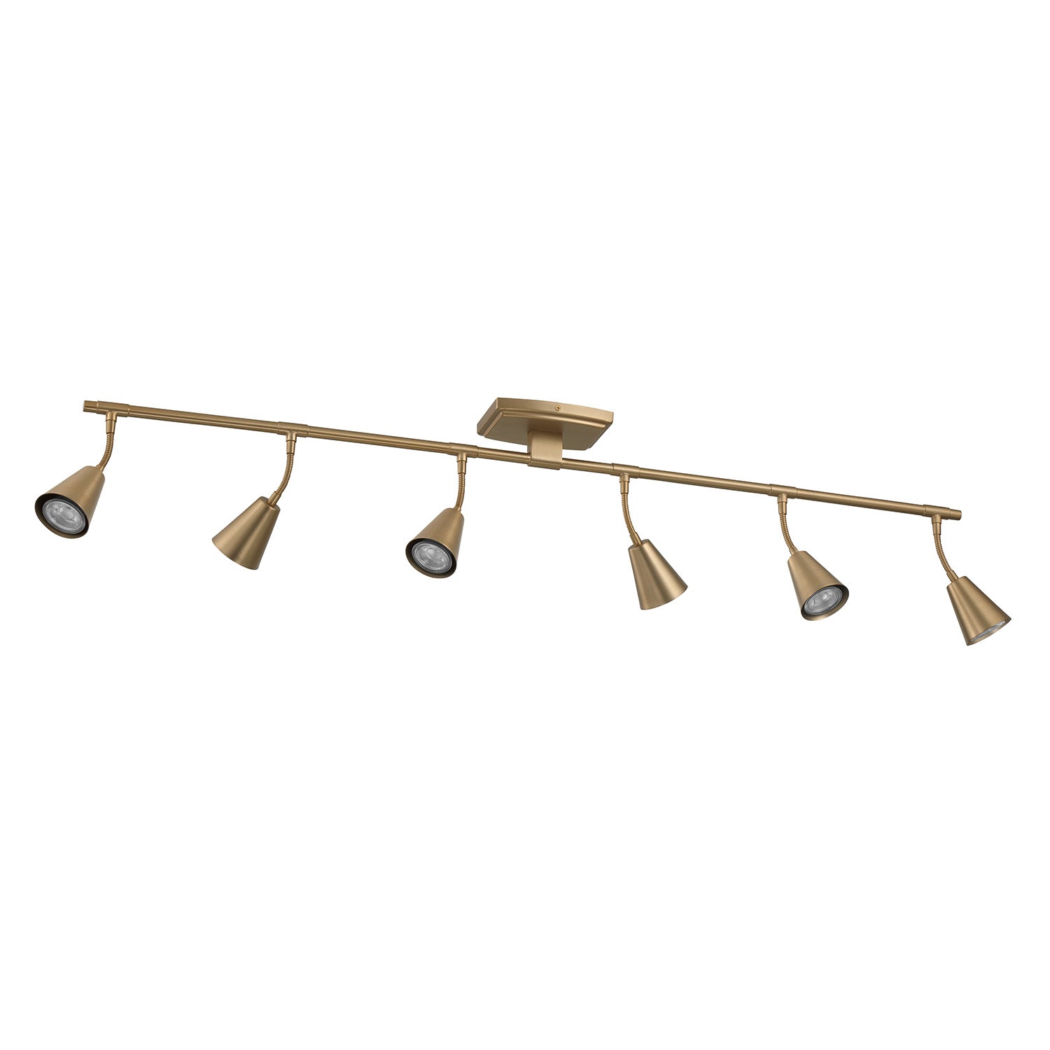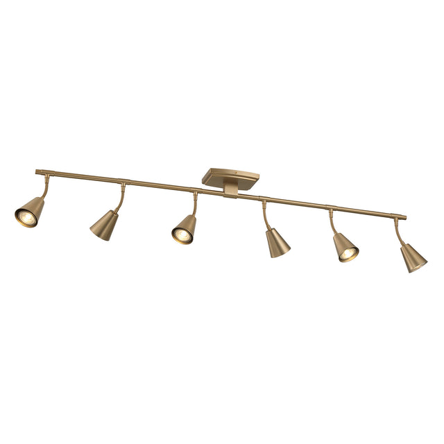 The Hudson 6-Light LED Fixed Track Light is a modern industrial take on a classic, functional ceiling light fixture. The six flexible sockets are fixed across the track light bar and attached to a matching canopy. The powerful GU10 LED light bulbs (included) provide a cheerful, bright white light at 420 lumens per bulb. A warm brushed brass finish, flexible swiveling heads, and dimming capability make this fixture ideal for indoor spotlights and versatile enough to place nearly anywhere. This incredibly adaptable fixture can be mounted as a flush-mount ceiling light or vanity wall light. Install in hallways, bathrooms, or in your living room or bedroom. Adjust the direction of the heads to spotlight wall art or direct additional visibility to whatever corner needs a little illumination.