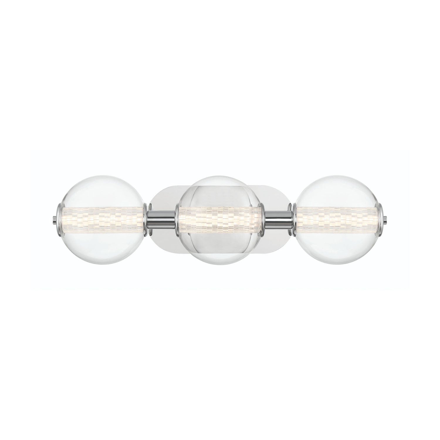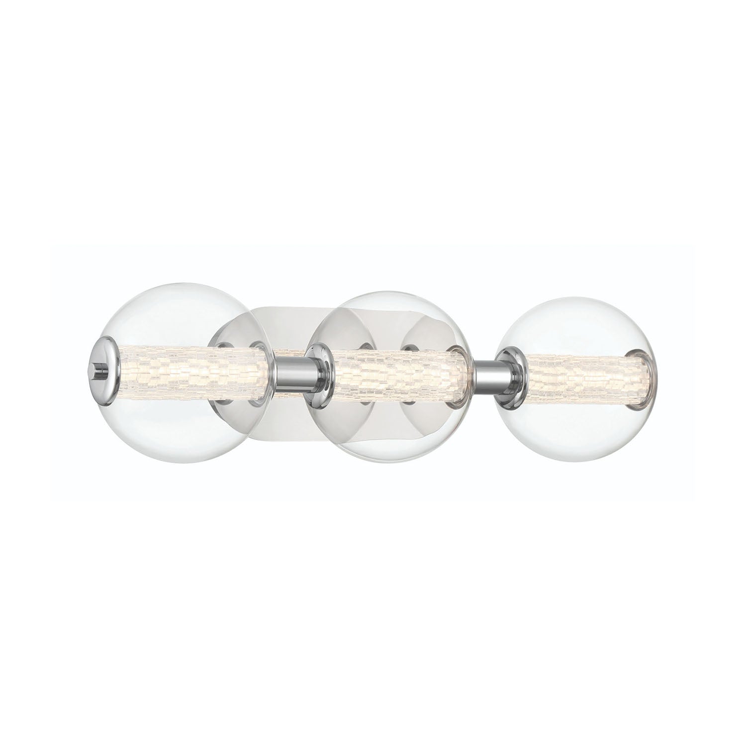 The Elara LED Vanity brings sculptural elegance to any bathroom with its striking sphere design and polished chrome finish. This captivating fixture features three perfectly proportioned clear glass spheres mounted along a sleek chrome framework, each housing LEDs surrounded by crystal details that create brilliant, multi-directional illumination and spectacular light refraction for professional-quality task lighting. The polished chrome and crystal-enhanced clear glass elements deliver contemporary artistry at its finest. At 25" wide with integrated LED technology, this vanity light makes a stunning focal point while providing decades of energy-efficient operation.
