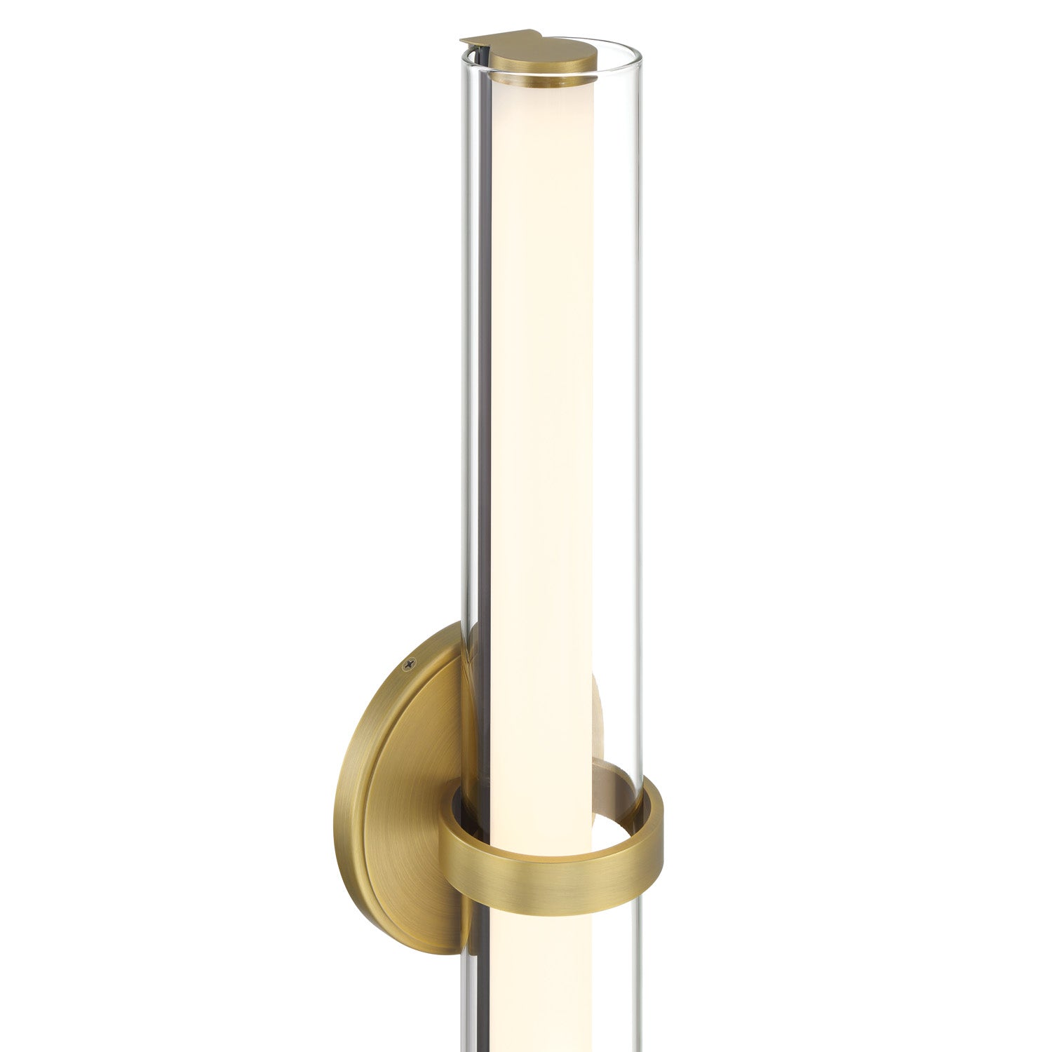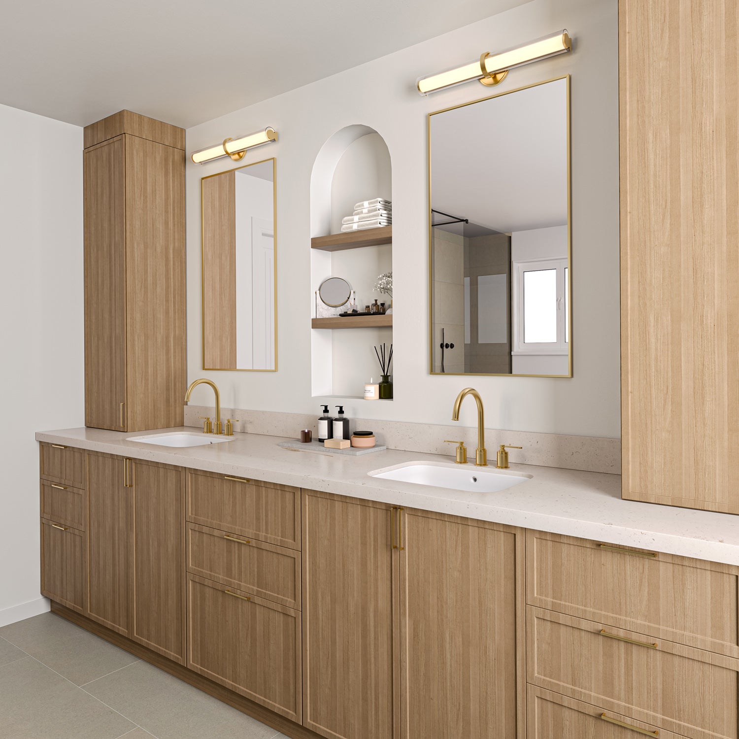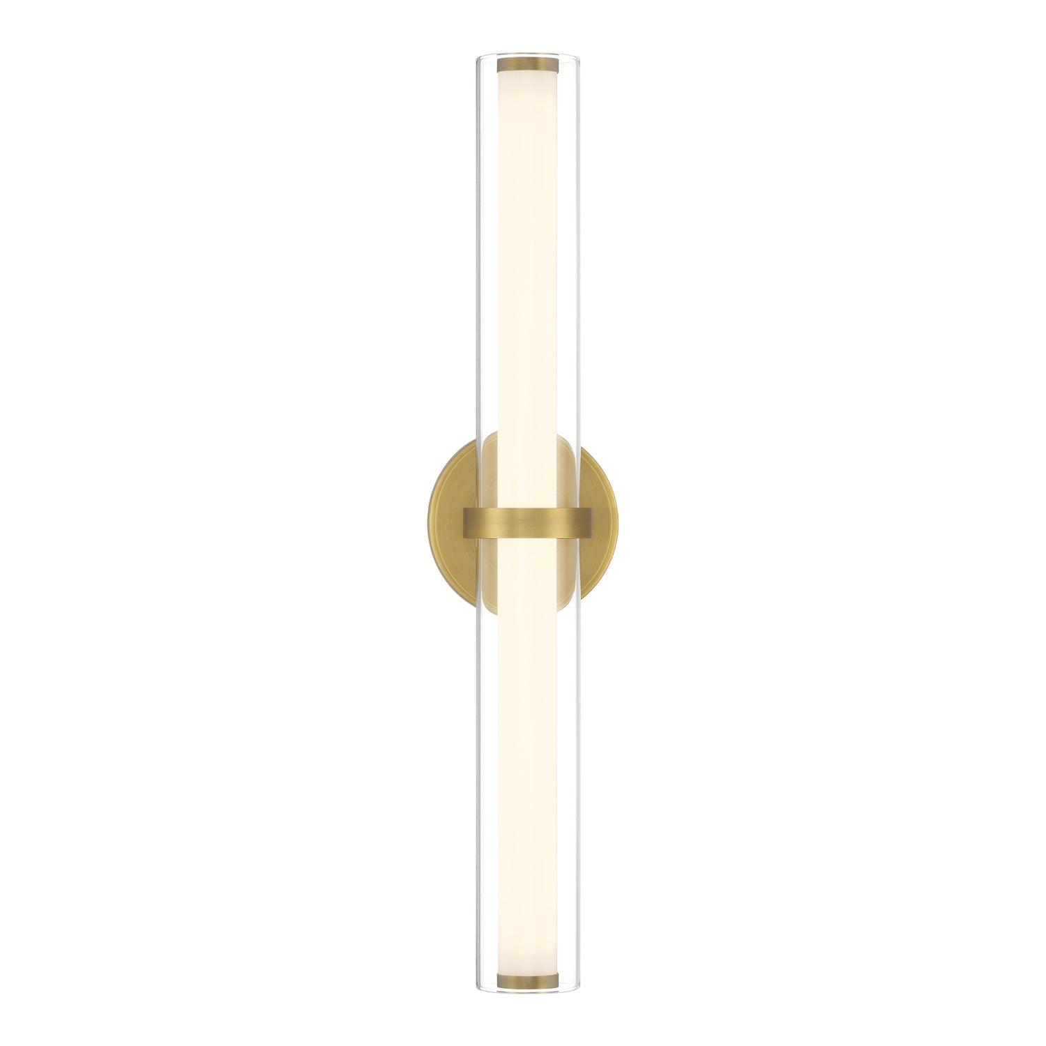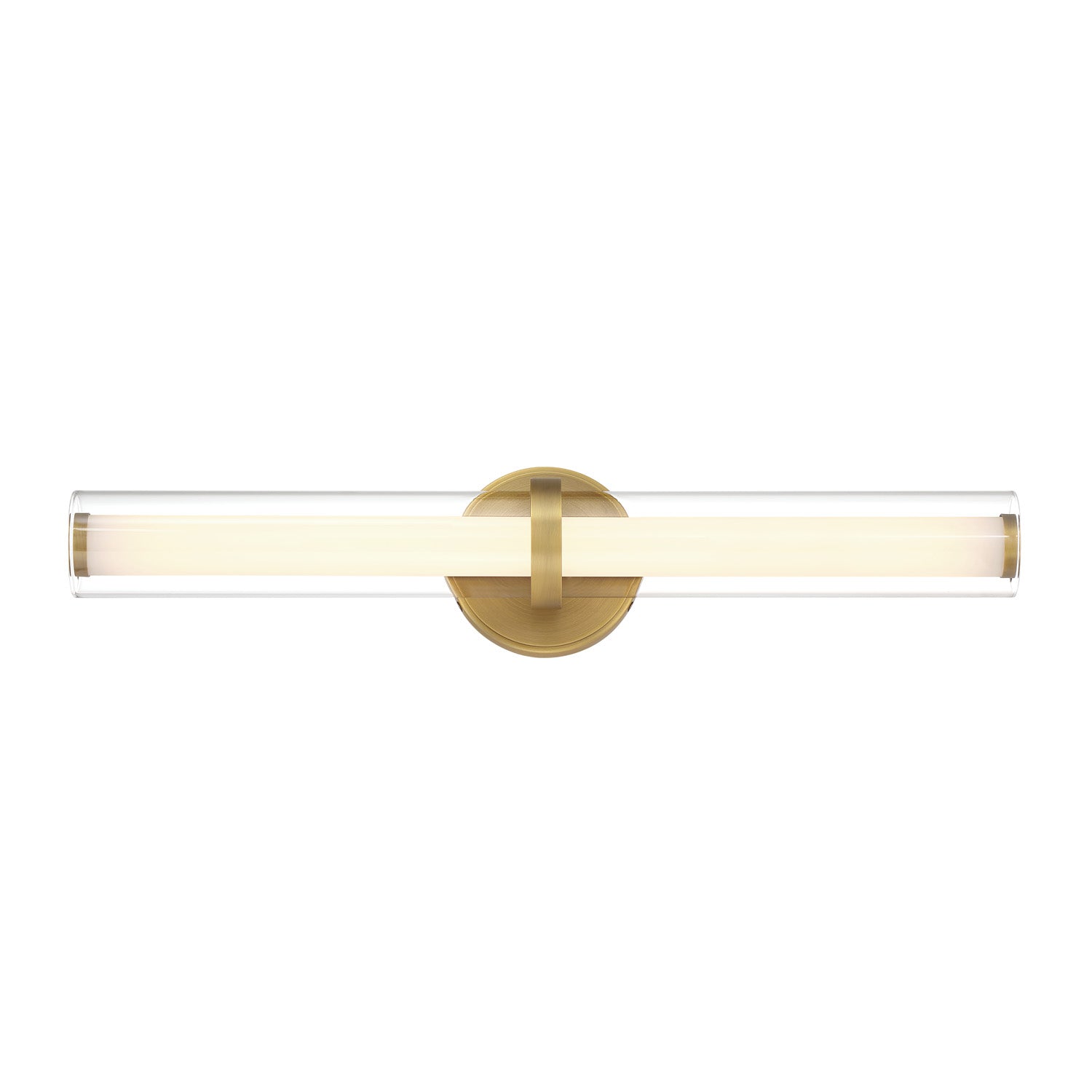 Distinctive and contemporary in design, the Ellie LED Vanity Light envelops whatever space it's in with soft, flattering light. This 24" bathroom vanity light is characterized by a dual-layered glass shade, consisting of an inner opal glass cylindrical light, nestled within a transparent outer glass shade. The opal glass gently diffuses the light of the integrated LEDs creating a pleasing glow that sparkles through the clear glass. Adding to its elegance, the light is accented with a decorative metal band, complementing the circular backplate, finished in a rich aged brass. The Ellie Vanity Light features smooth dimming capabilities and can be mounted either horizontally or vertically, making it ideal for use in a bathroom above a vanity or as wall sconces flanking a mirror.