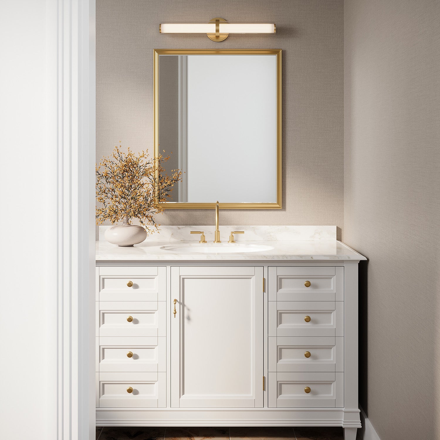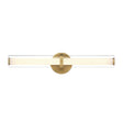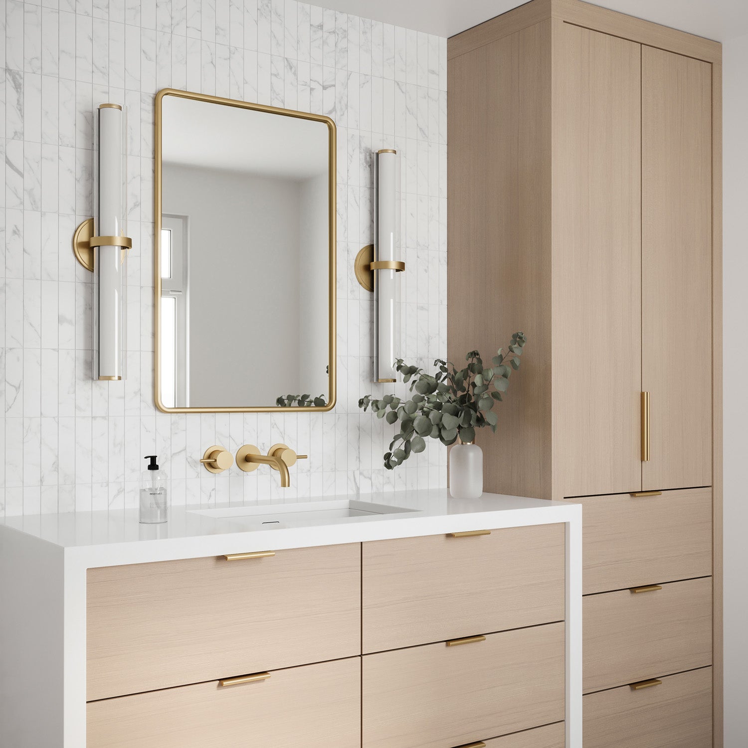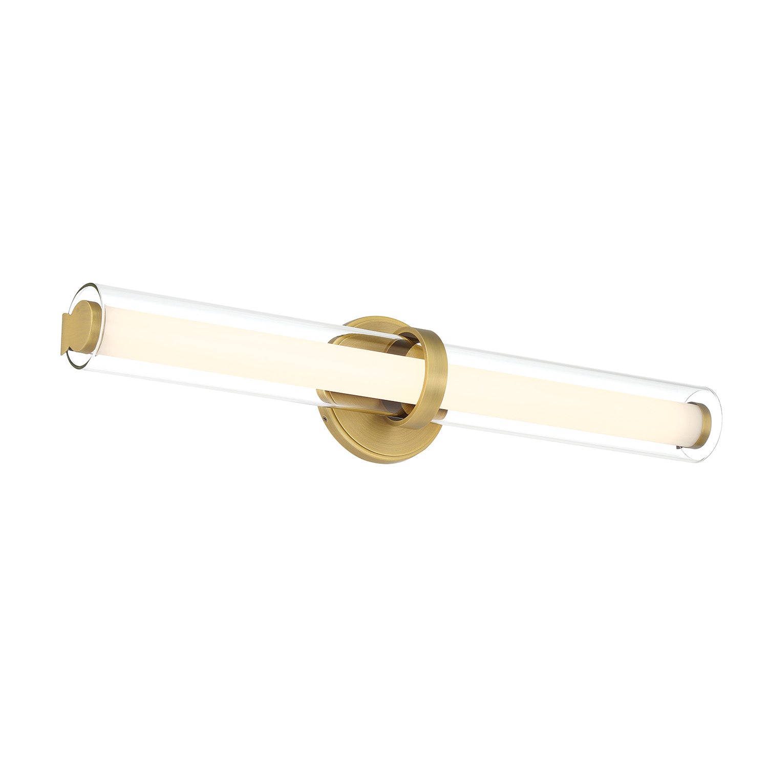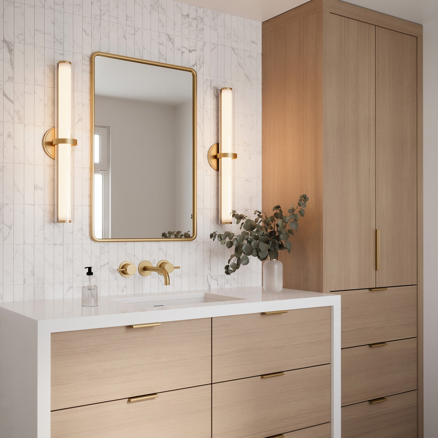 Distinctive and contemporary in design, the Ellie LED Vanity Light envelops whatever space it's in with soft, flattering light. This 24" bathroom vanity light is characterized by a dual-layered glass shade, consisting of an inner opal glass cylindrical light, nestled within a transparent outer glass shade. The opal glass gently diffuses the light of the integrated LEDs creating a pleasing glow that sparkles through the clear glass. Adding to its elegance, the light is accented with a decorative metal band, complementing the circular backplate, finished in a rich aged brass. The Ellie Vanity Light features smooth dimming capabilities and can be mounted either horizontally or vertically, making it ideal for use in a bathroom above a vanity or as wall sconces flanking a mirror.