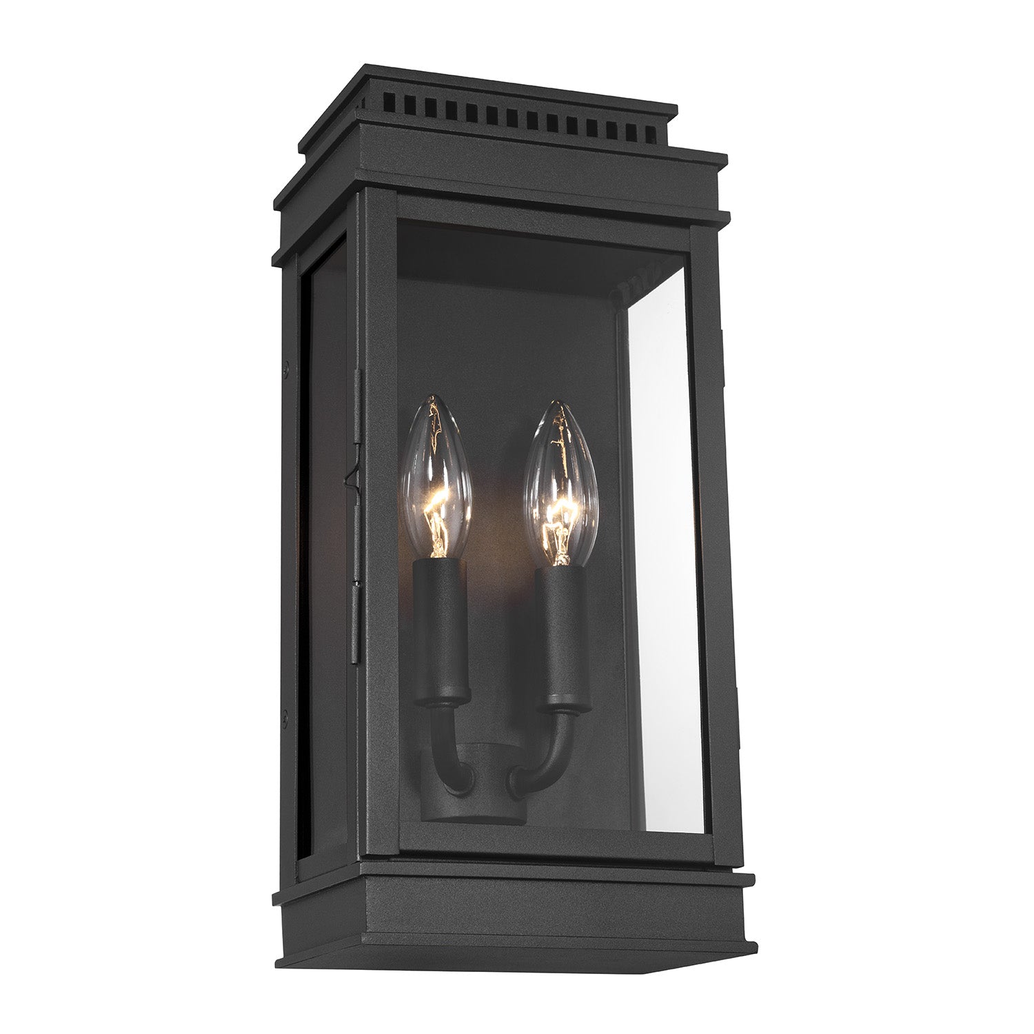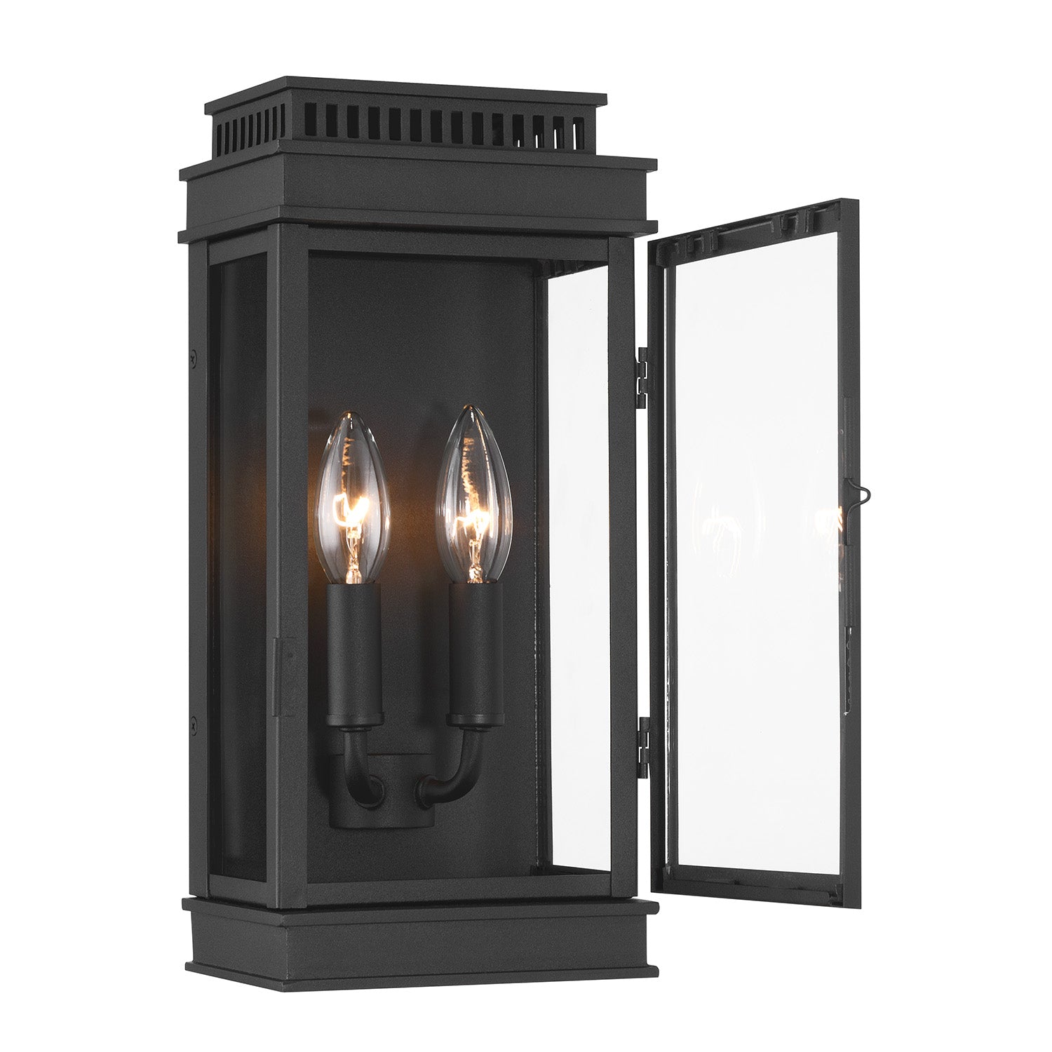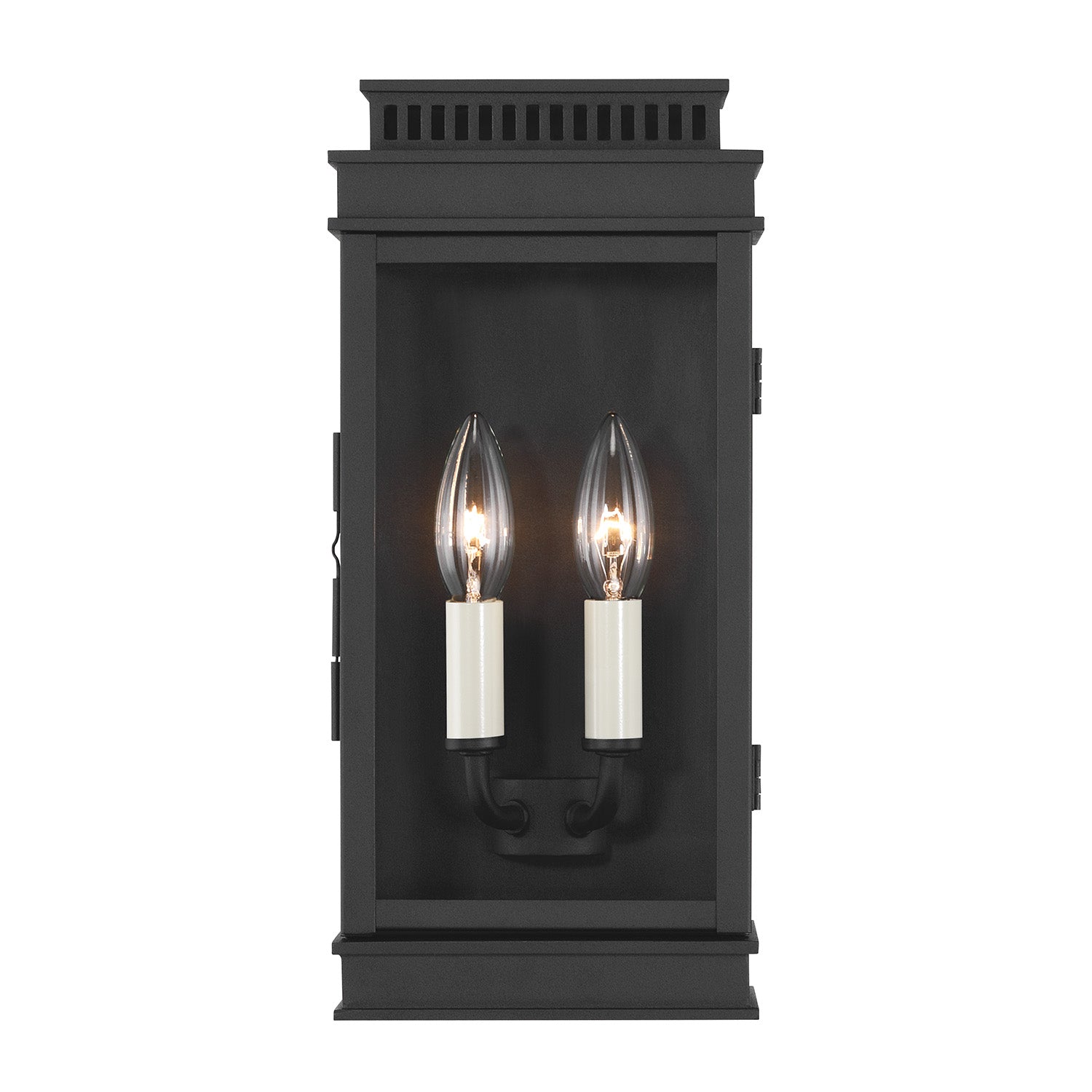 • Brighton outdoor wall-mounted light features two candelabra bulbs, set on curved arms inside a closed, rectangular frame with glass sides and a hinged front panel for easy access