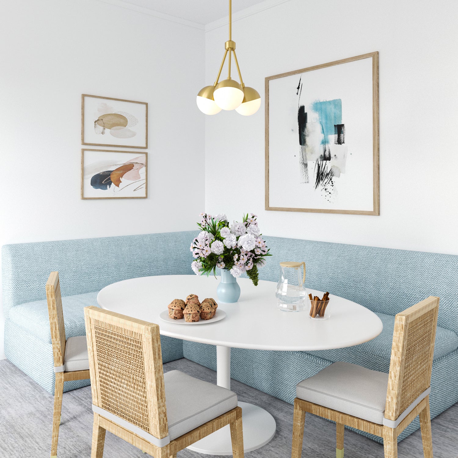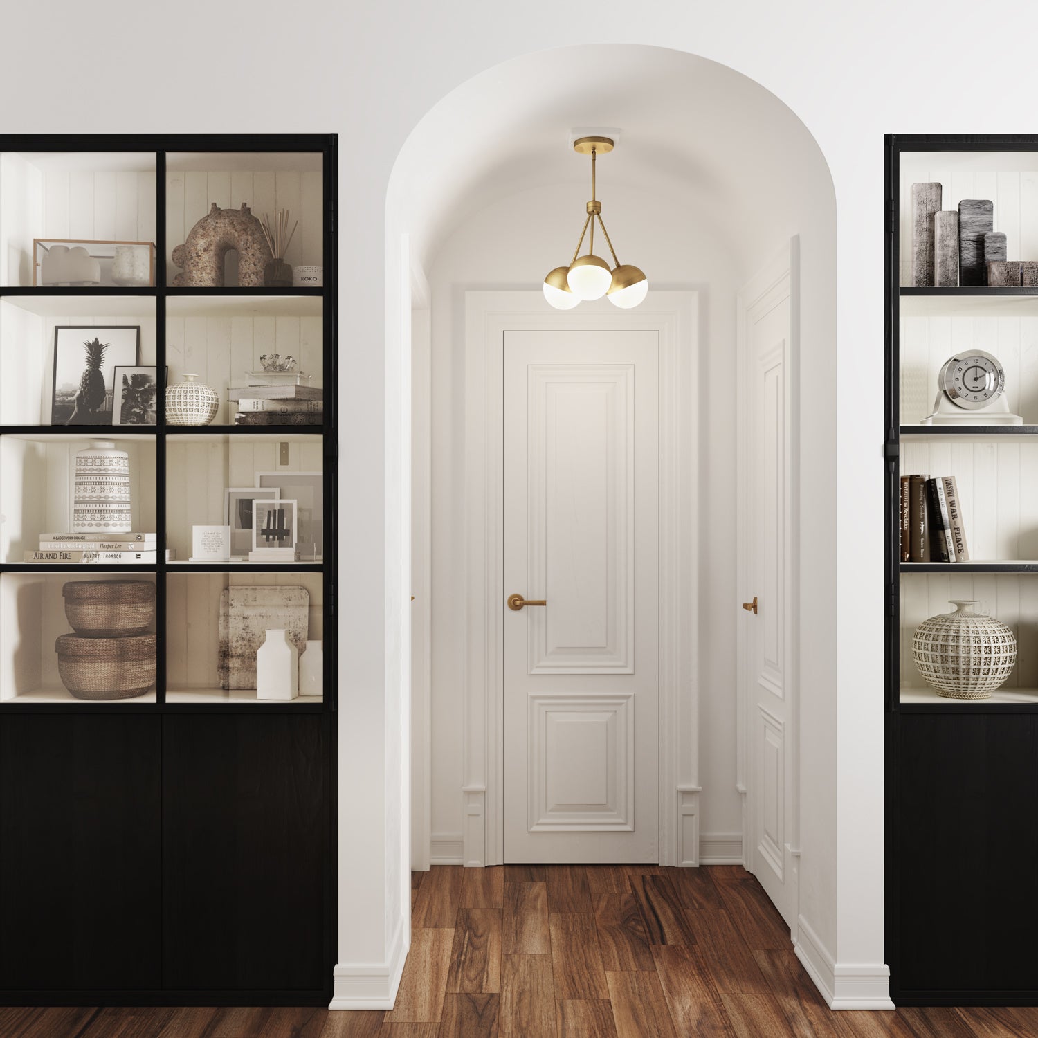 Our Powell Collection is a nod to classic mid-century design, only reimagined for the modern home. The collection highlights the simplicity of the sphere with elevated finishes, and frosted, white globes. This simple, yet elegant aged brass chandelier features three hooded, white globe lights suspended from a singular down rod and round ceiling canopy. Balancing beauty with utility, the Powell uses high-lumen, dimmable LED bulbs that cast a warm white glow and create an inviting atmosphere. With the removal of the down rod, this chandelier conveniently converts to a semi-flush mount, allowing for a wider range of placement possibilities. Makes a statement above a small dining table, in a sitting room, or foyer.