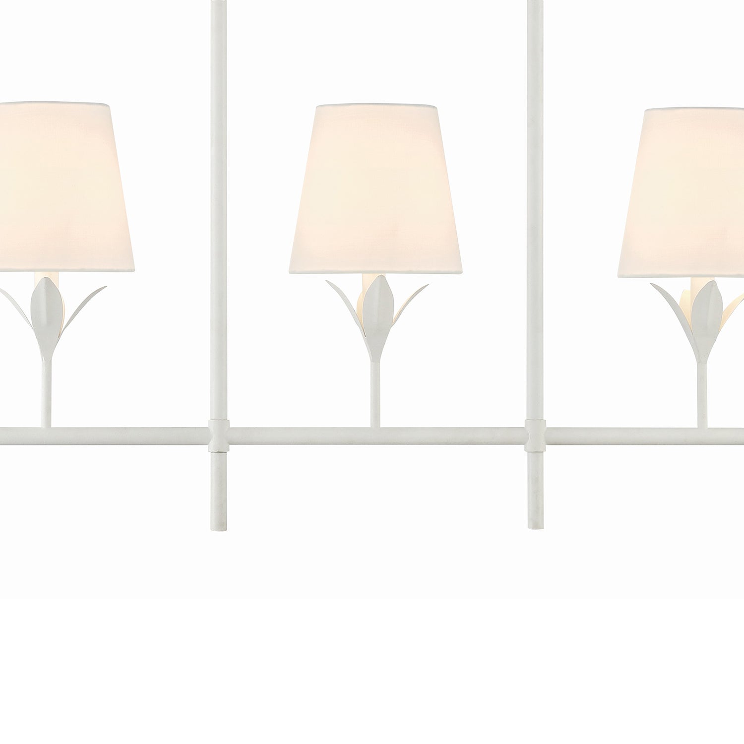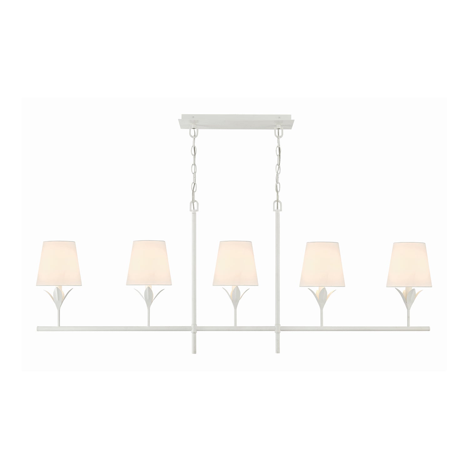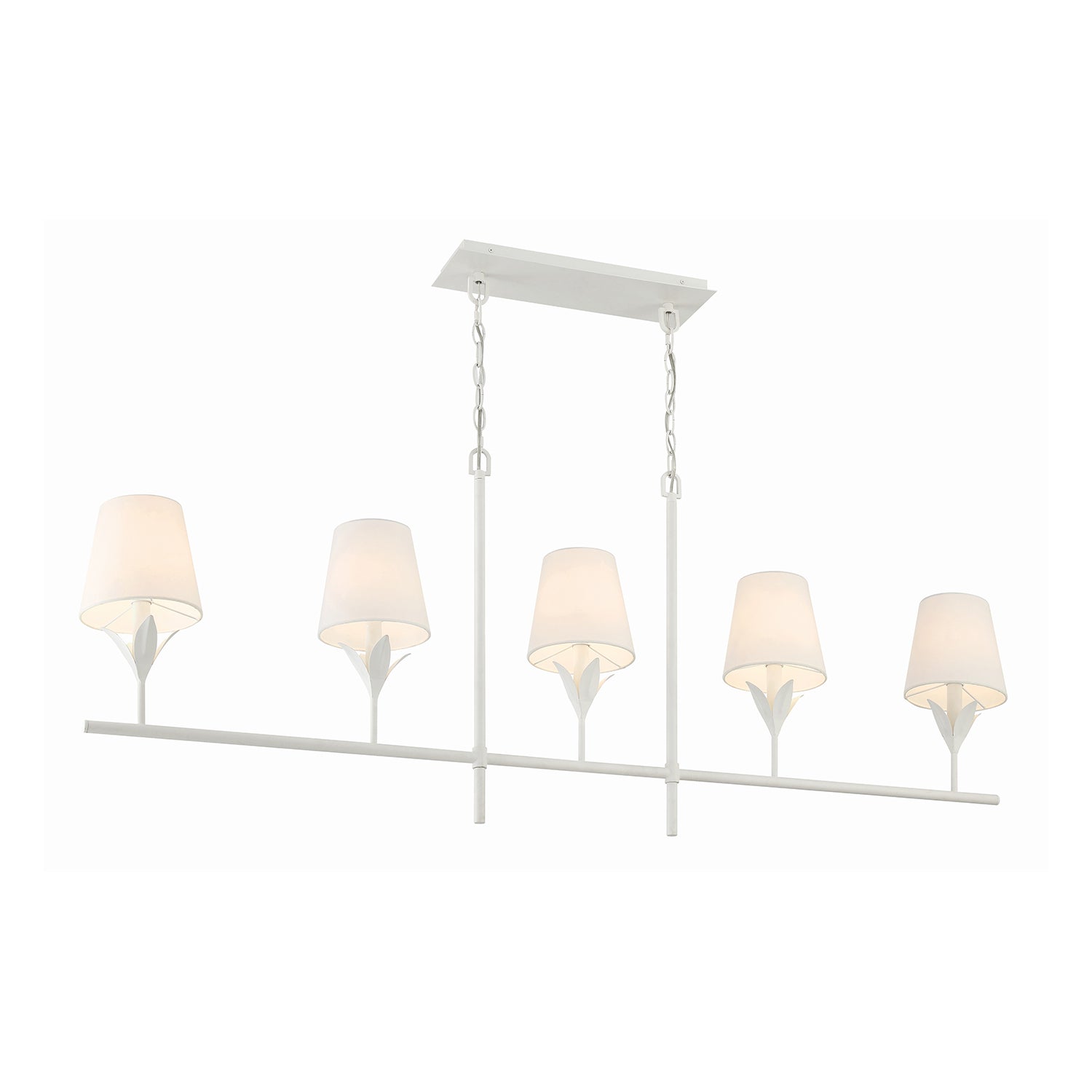 The Alice 5 Light Linear Chandelier brings refined elegance to your space with its sculptural leaf details and tailored white fabric shades. Finished in crisp matte white, this fixture balances timeless charm with a hint of vintage inspiration. Five crisp fabric shades diffuse light beautifully, casting a warm, inviting glow. Its elongated 53.5" frame makes a striking statement over rectangular dining tables, kitchen islands, or long entryways while maintaining graceful proportions. The included 72" chain and adjustable rods allow for customizable hanging height, ensuring a perfect fit for your space.