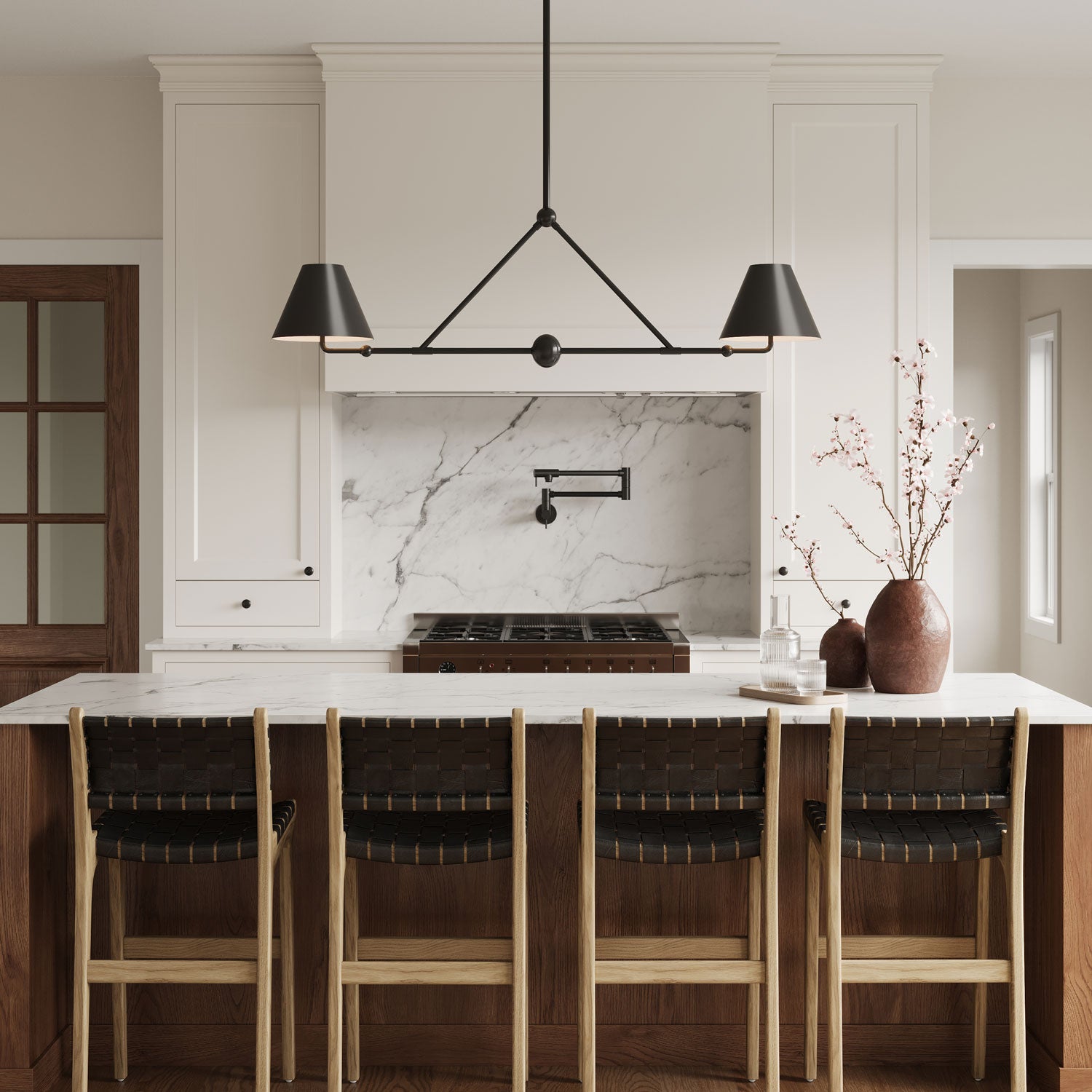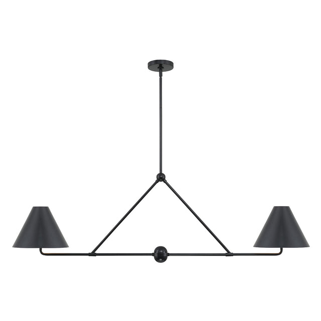 The Banks 2 Shade Linear Pendant brings modern elegance and clean lines to long dining tables and kitchen islands. Two matte black conical metal shades are spaced along a streamlined 54" wide frame, creating a bold, balanced design. The shades direct focused light downward, offering both ample illumination and visual impact. The all-matte-black finish enhances its sleek, contemporary appeal, seamlessly integrating with both industrial and modern interiors. With its minimalist profile and thoughtful proportions, this pendant offers the perfect balance of form and function.