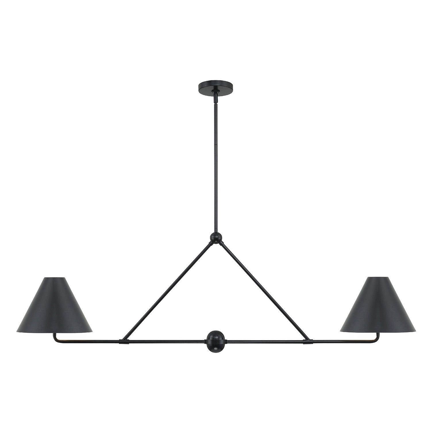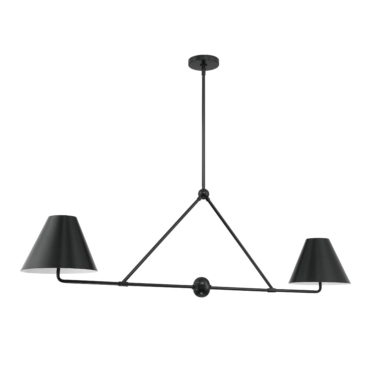 • A bold linear pendant with two conical matte black metal shades and a matching matte black frame, offering a striking balance of style and sophistication
