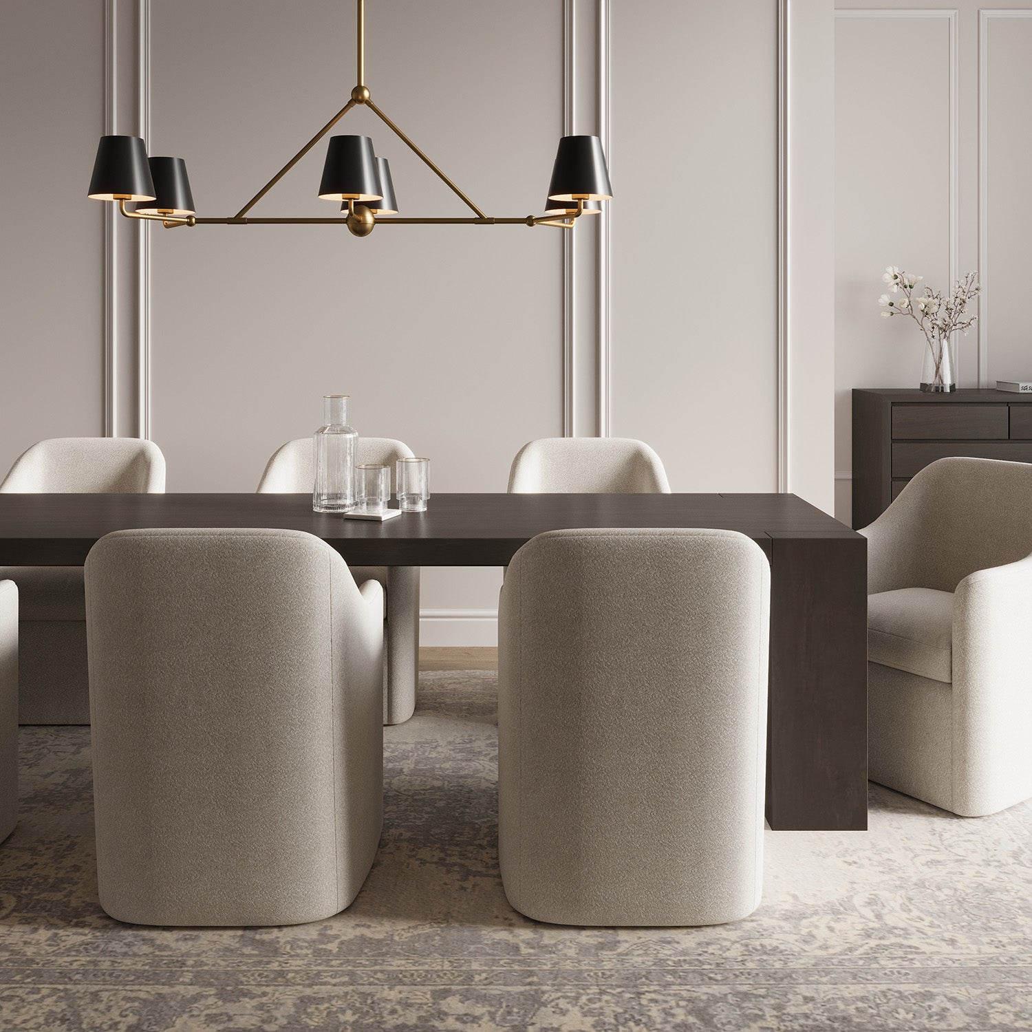 The Banks 6 Light Linear Chandelier makes a striking statement with its streamlined silhouette and refined contrast. Featuring six matte black conical metal shades with white interiors and a brass body, this fixture provides focused illumination, perfect for long dining tables, kitchen islands, or statement entryways. The combination of black and brass adds warmth and sophistication while effortlessly complementing a range of interior styles. Thoughtfully designed with clean lines and balanced proportions, this chandelier commands attention without overwhelming the space—an ideal fusion of presence and refinement for the modern home.