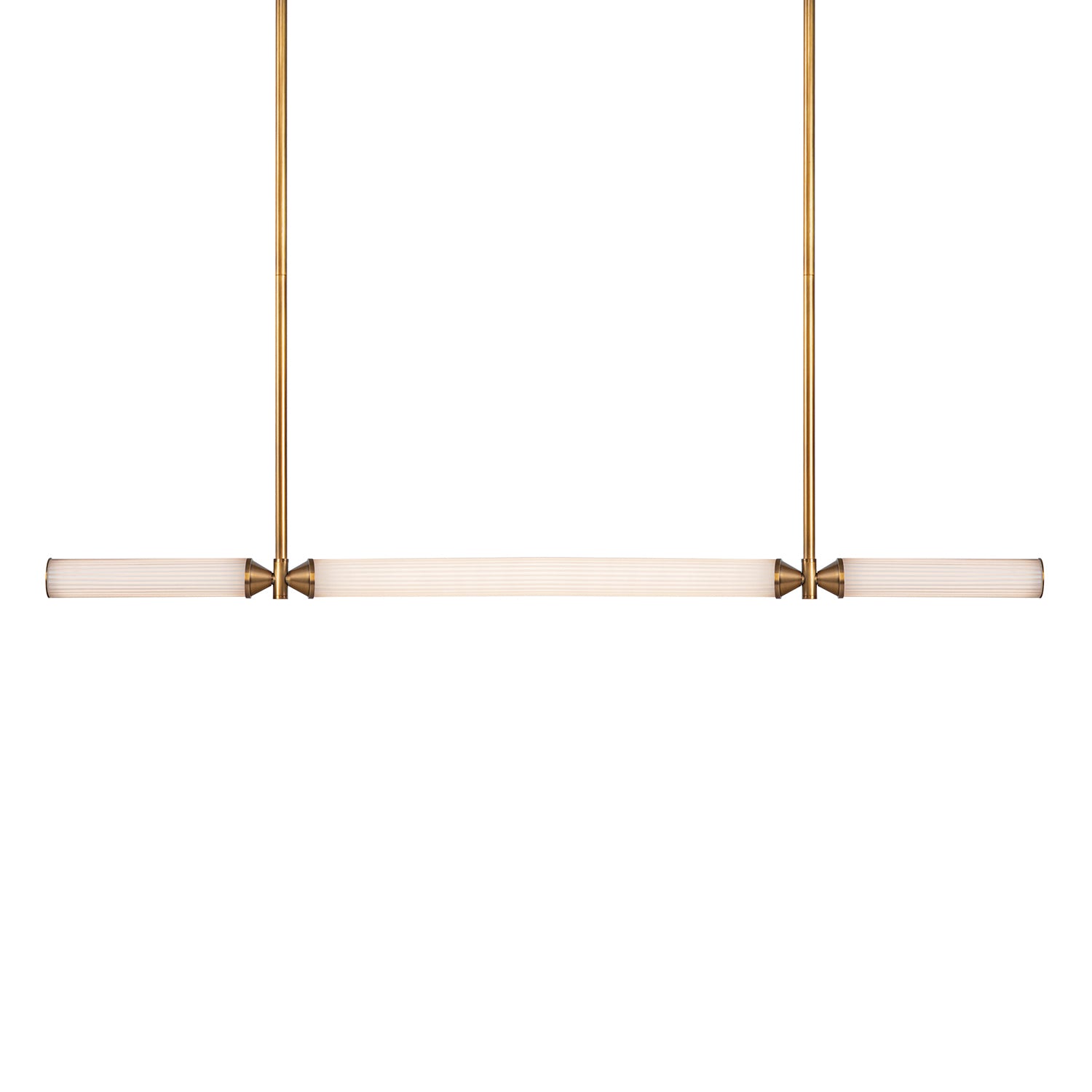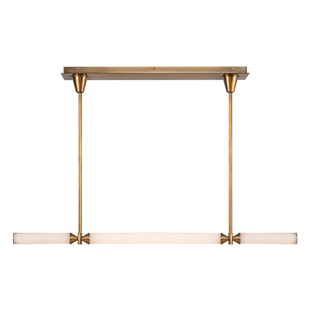 • Features a 48" long opal ribbed glass LED tube with textured detailing suspended from two adjustable rods and a rectangular canopy, finished in a warm Vintage Brass