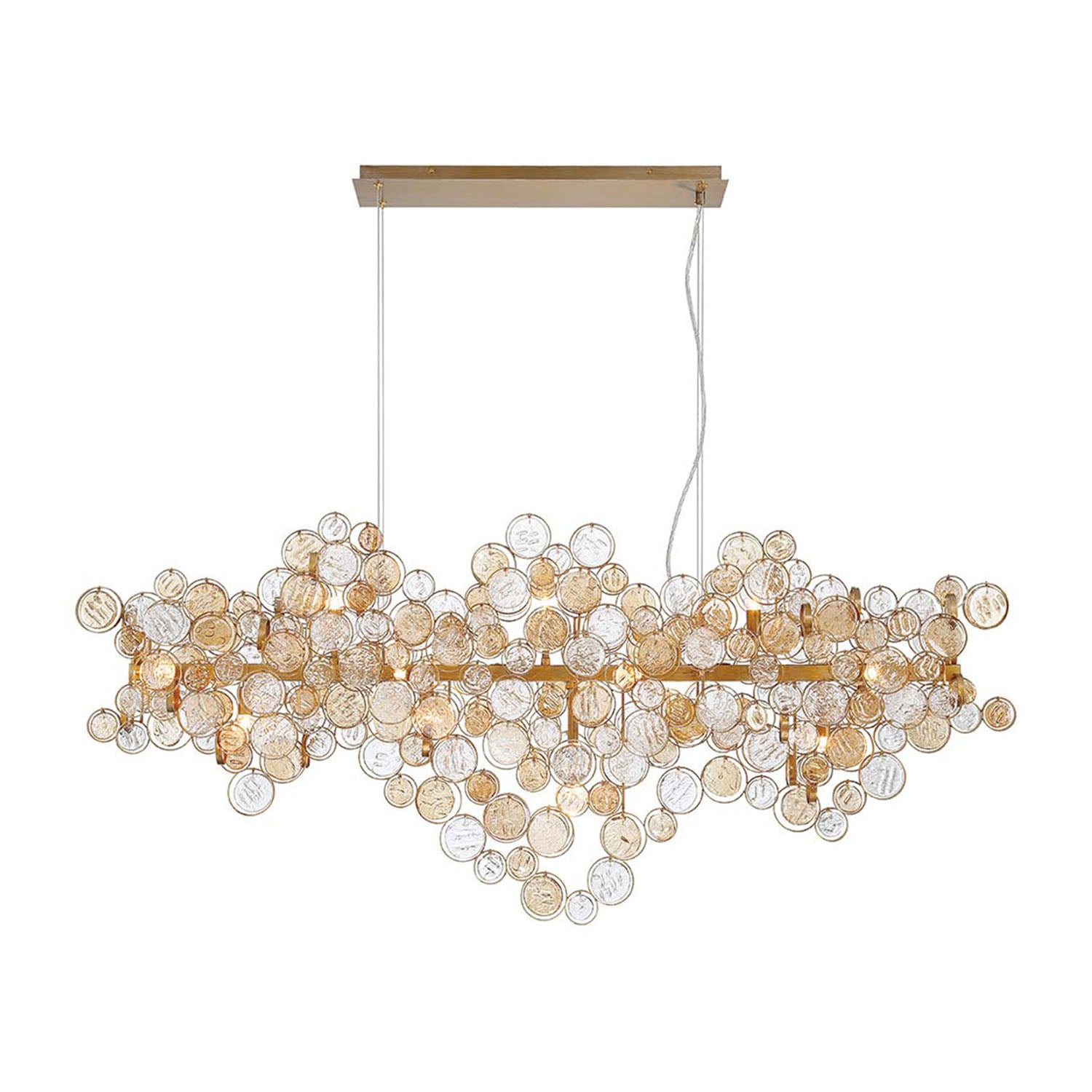 The Denali 15 Light Linear Chandelier brings dramatic luxury to any space with its stunning cluster disc design and antique gold finish. This captivating fixture features multiple beautifully crafted topaz glass shades arranged in an artful linear composition, creating brilliant golden illumination that transforms dining rooms, kitchen islands, and entertaining spaces into warm, inviting gathering places. The rich topaz glass elements capture and amplify light, delivering a magnificent glow that serves as a brilliant focal point for social spaces. The antique gold framework and glowing topaz glass deliver contemporary luxury with timeless sophistication. At 56" in length with its distinctive clustered arrangement, this chandelier makes an unforgettable centerpiece that elevates any room with golden elegance.