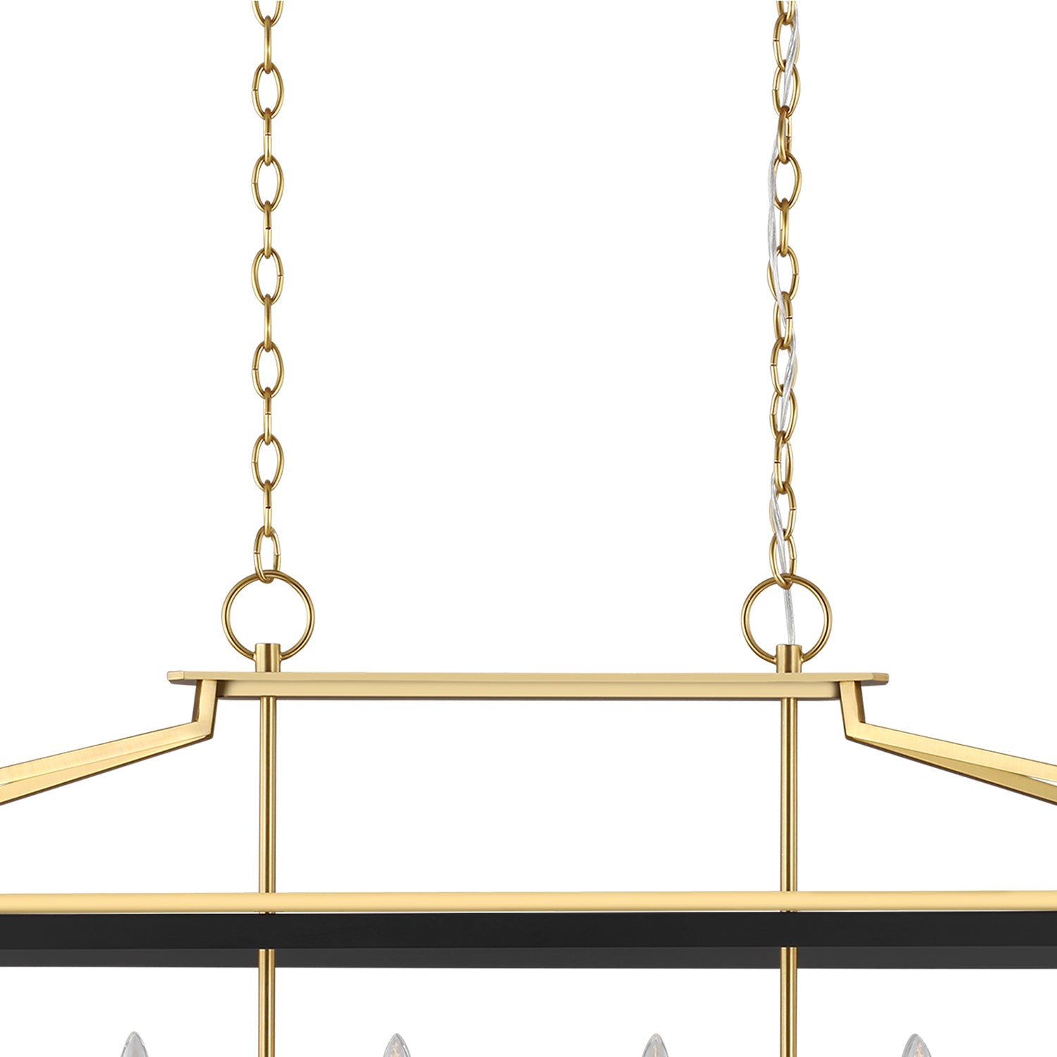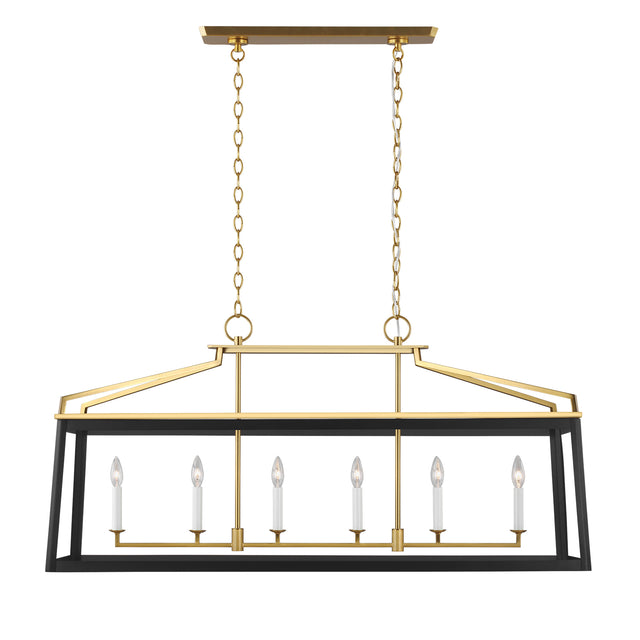 The Fillmore Linear Lantern Pendant makes a refined statement with its traditional form and timeless appeal. Its beautifully tapered square silhouette is presented in a linear form, suspended from a clean-lined modern brass frame. This commanding fixture is thoughtfully designed with a single row of six candelabra lights, providing sophisticated illumination that is perfect for a dining table or kitchen island. The sophisticated two-tone finish of a matte black exterior and a warm modern brass frame creates a high-contrast statement that adds both functional beauty and enduring style to any space.