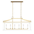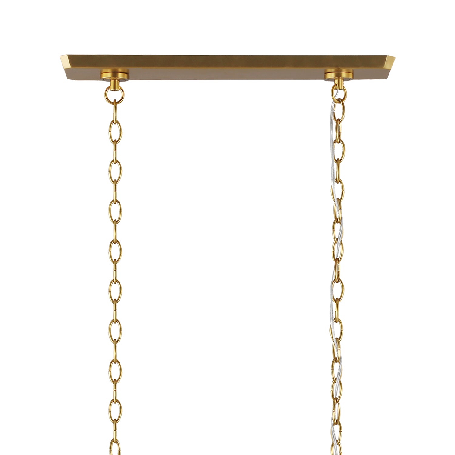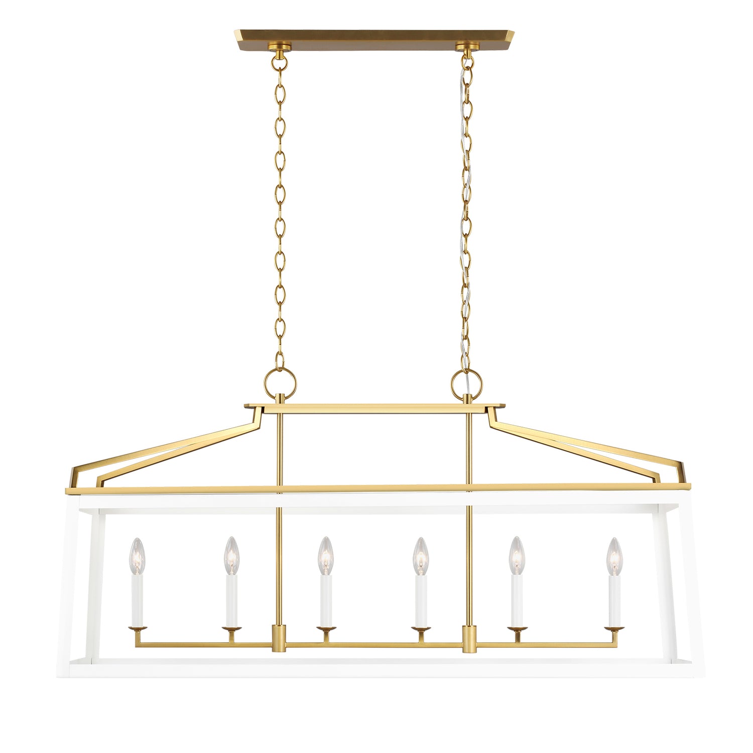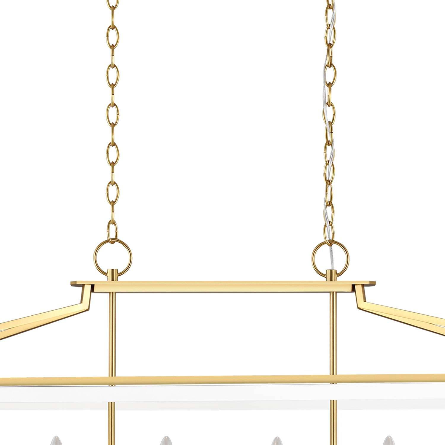The Fillmore Linear Lantern Pendant makes a refined statement with its traditional form and timeless appeal. Its beautifully tapered square silhouette is presented in a linear form, suspended from a clean-lined modern brass frame. This commanding fixture is thoughtfully designed with a single row of six candelabra lights, providing sophisticated illumination that is perfect for a dining table or kitchen island. The clean, two-tone finish of a crisp matte white exterior and a warm modern brass frame creates a fresh, contemporary look that adds both functional beauty and enduring style to any space.