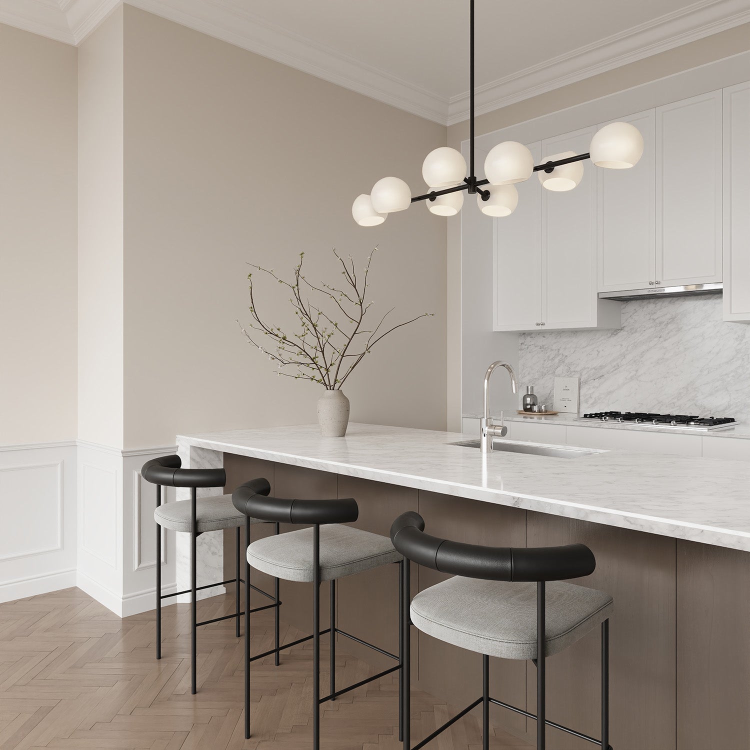 • Features eight opal glass globes arranged along a horizontal matte black bar in a sophisticated linear design
