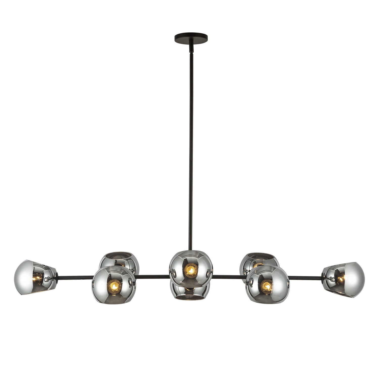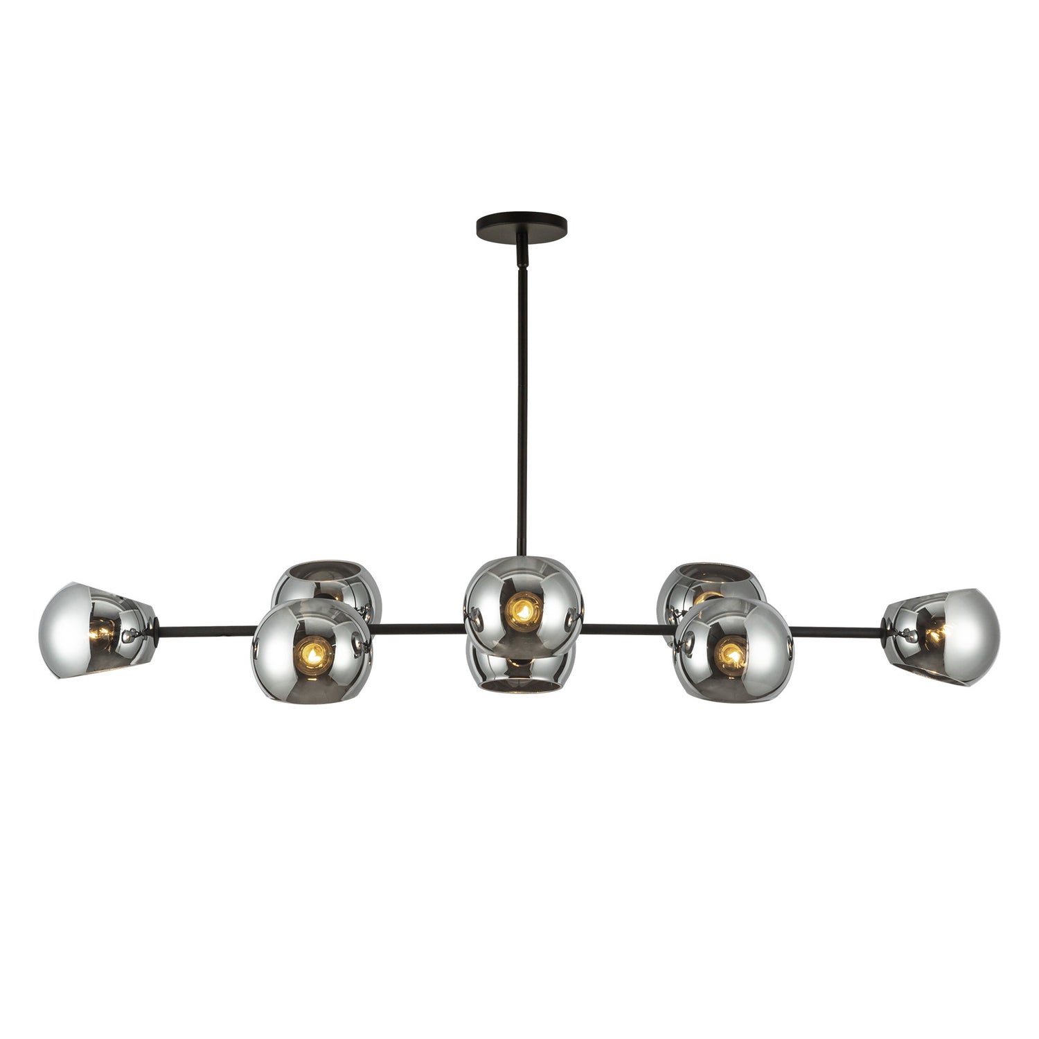 • Features eight mirrored smoke glass globes arranged along a horizontal matte black bar in a sophisticated linear design