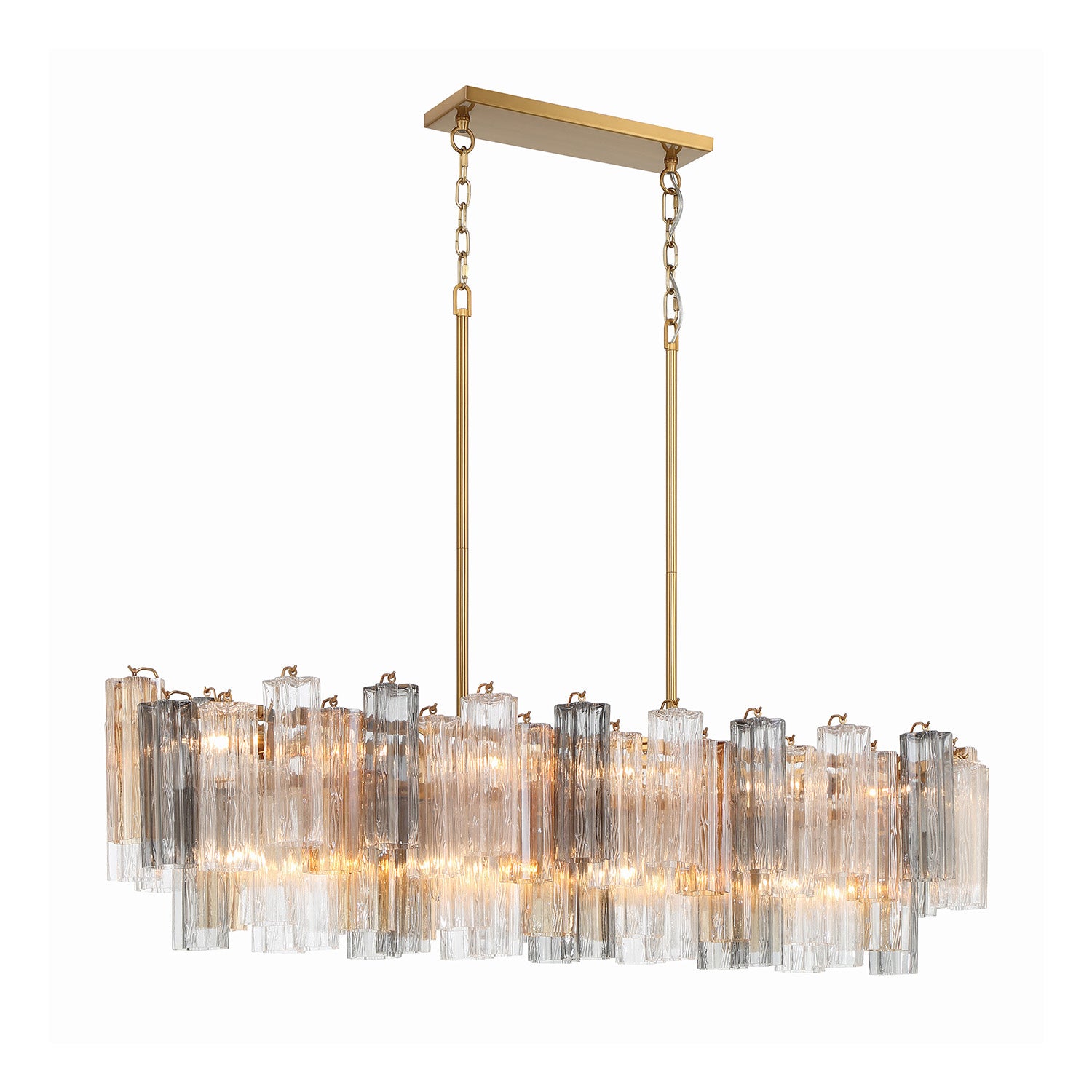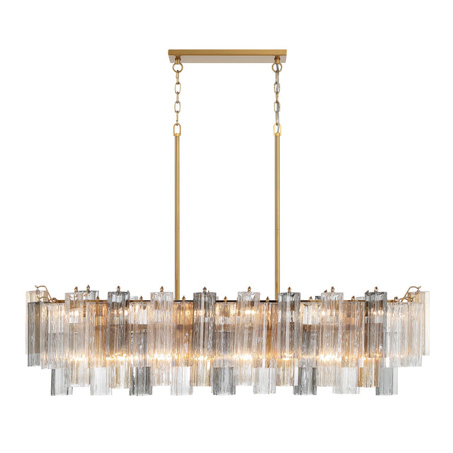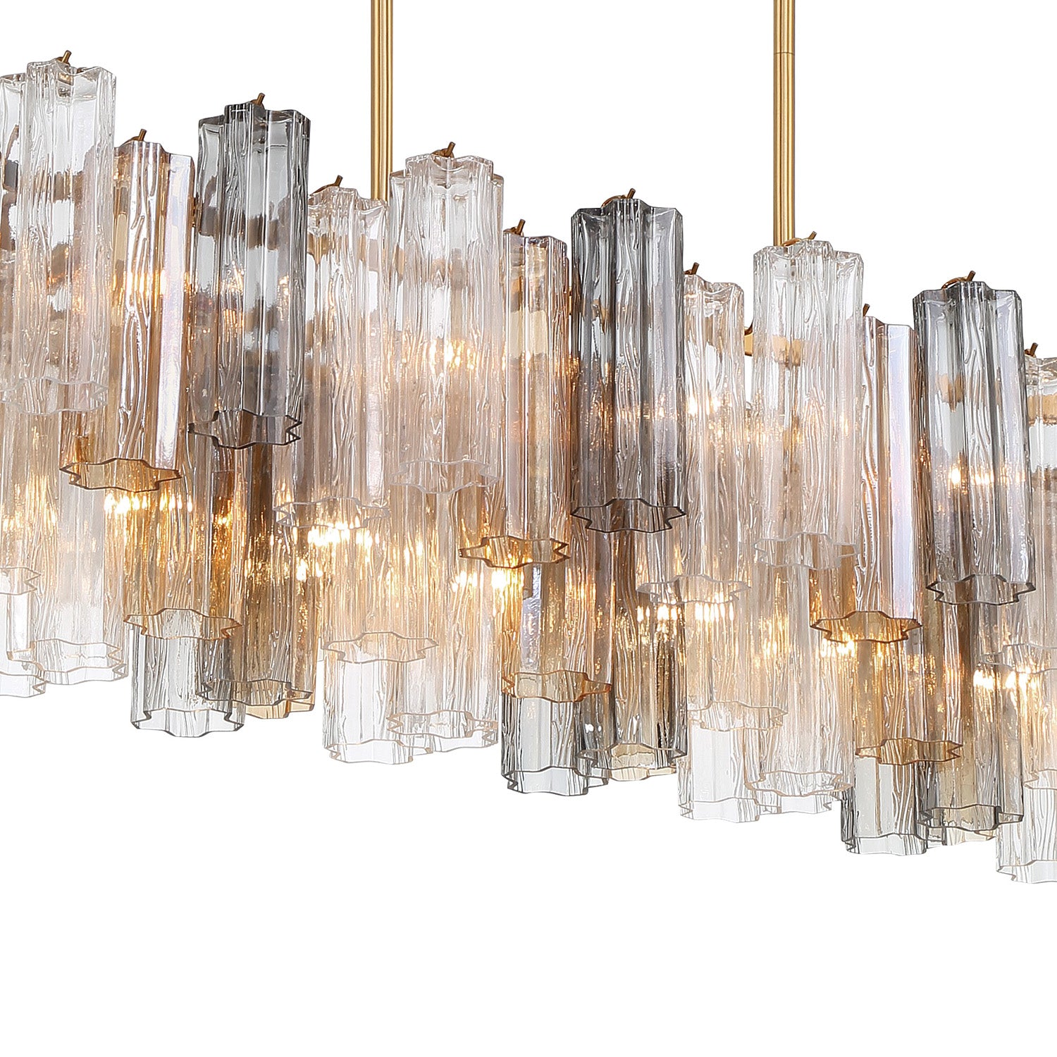 The Grace Linear Chandelier makes a stunning statement with its impressive combination of rich brass finish and lustrious gilded fog textured Tronchi glass. This spectacular fixture features cascading textured glass tubes arranged in a dramatic linear formation, creating beautiful light diffusion while commanding attention in dining rooms, above large kitchen islands, and in living spaces. The warm brass framework provides structural elegance, while the multi-colored glass delivers soft, evenly distributed illumination that bathes spaces in luxurious ambiance. At an impressive 52" in length with 14 light sources, this grand chandelier delivers both substantial presence and abundant illumination. The multi-panel glass design creates captivating shadows and light patterns throughout the room, making it the perfect centerpiece for sophisticated interiors.