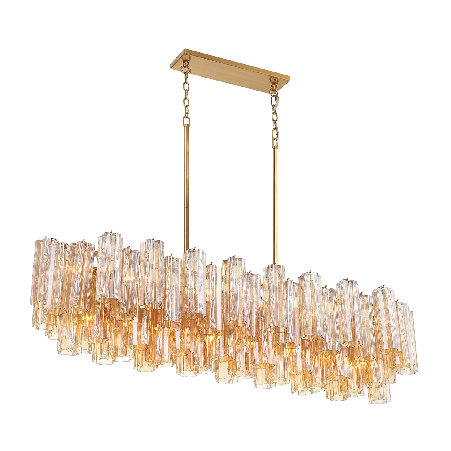 The Grace Linear Chandelier makes a stunning statement with its impressive combination of rich brass finish and lustrious topaz textured Tronchi glass. This spectacular fixture features cascading textured glass tubes arranged in a dramatic linear formation, creating beautiful light diffusion while commanding attention in dining rooms, above large kitchen islands, and in living spaces. The warm brass framework provides structural elegance, while the warm topaz glass delivers soft, evenly distributed illumination that bathes spaces in luxurious ambiance. At an impressive 52" in length with 14 light sources, this grand chandelier delivers both substantial presence and abundant illumination. The multi-panel glass design creates captivating shadows and light patterns throughout the room, making it the perfect centerpiece for sophisticated interiors.