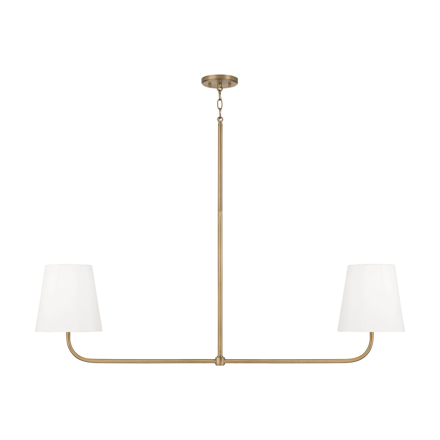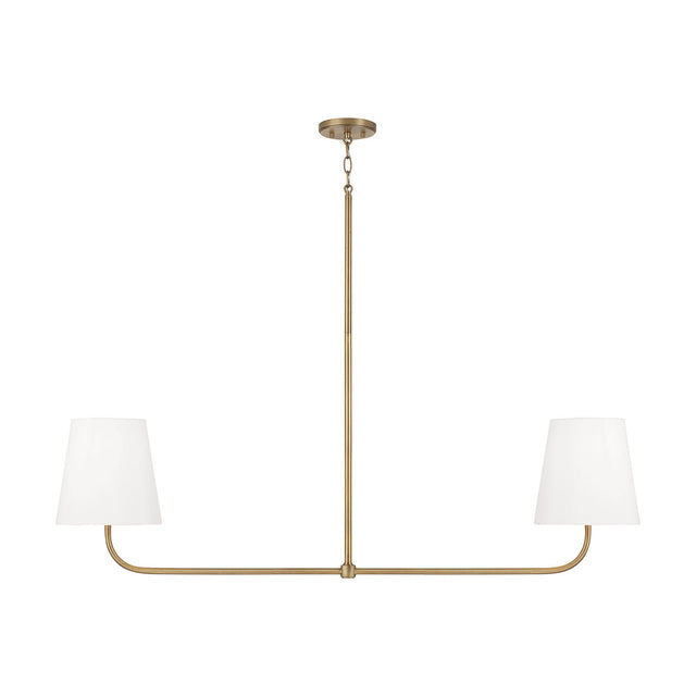 The Lior 2 Light Linear Chandelier brings classic elegance to any space with its refined linear design and warm aged brass finish. Featuring two white fabric shades suspended from an elegant, graceful frame, this impressive fixture delivers soft, diffused illumination perfect for kitchen islands, dining tables, or large workspaces. The warm aged brass finish combined with crisp white fabric shades creates timeless sophistication that elevates any space. The Lior chandelier combines graceful lines with refined materials to create a distinctive lighting statement that enhances your space with enduring elegance.