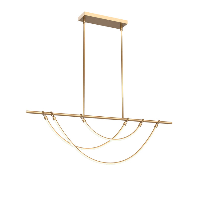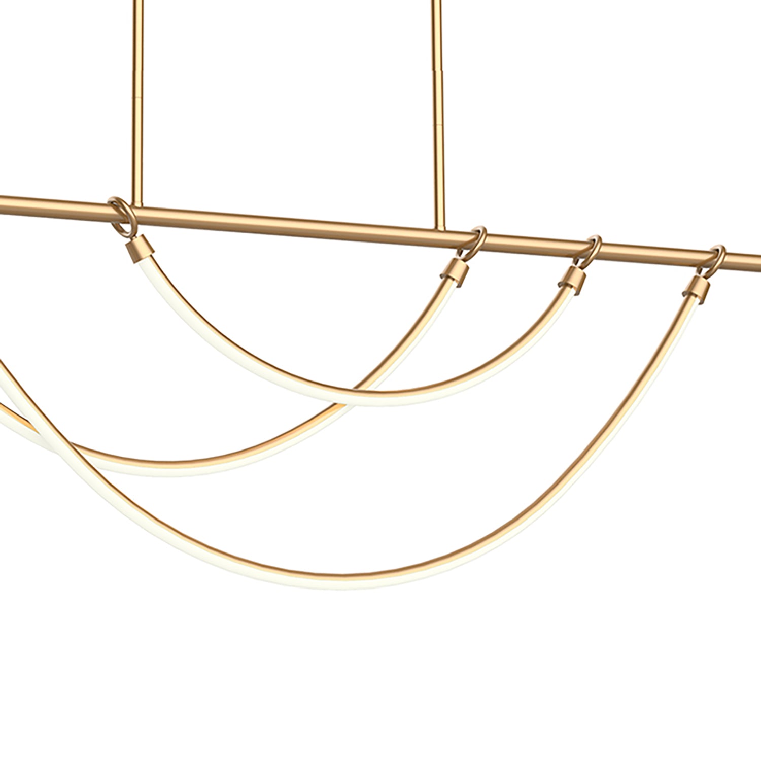 • The Otis Linear LED Pendant features three curved LED ribbons, suspended by a horizontal bar in a warm vintage brass finish
