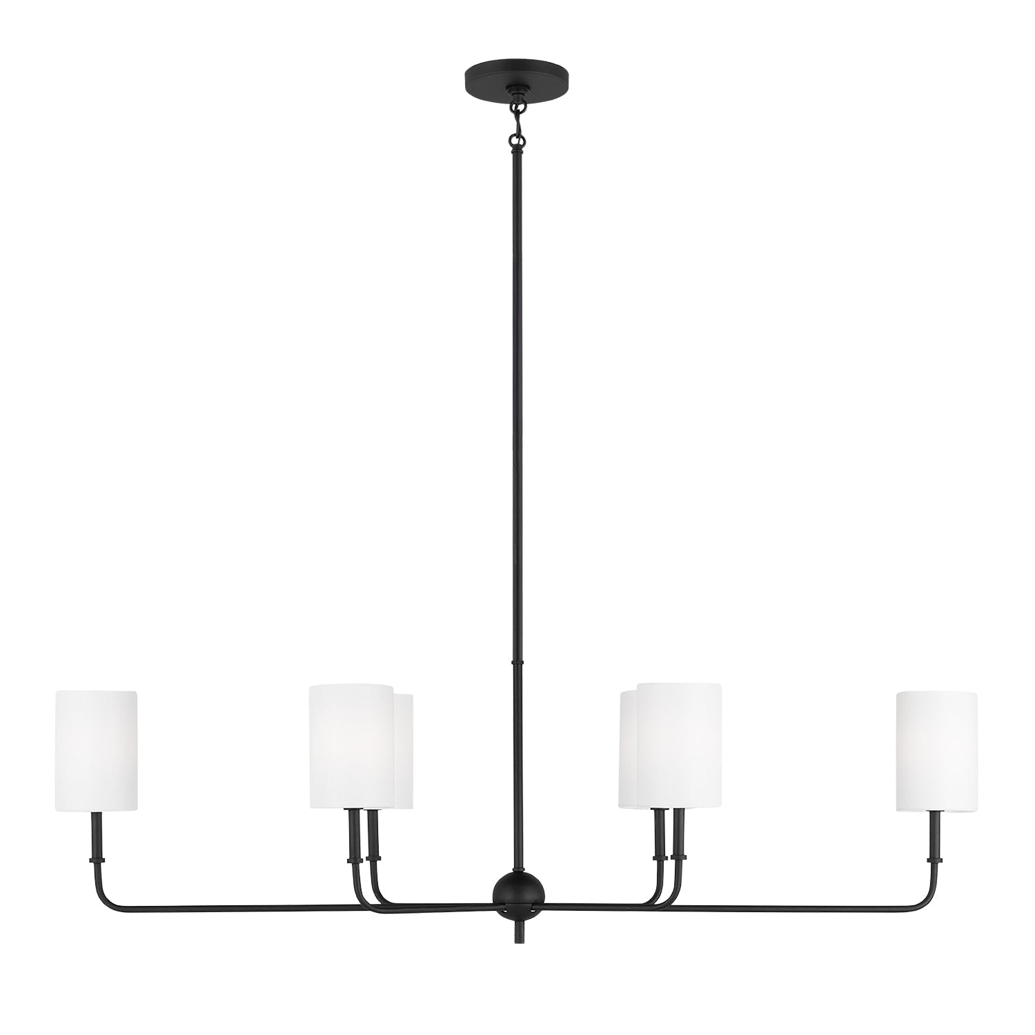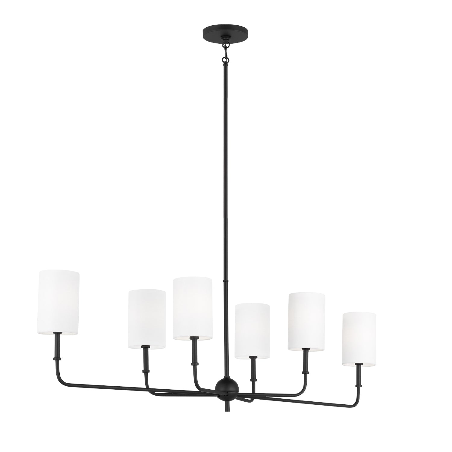 The Remington 6 Light Linear Chandelier delivers a timeless and understated style with its long, horizontal profile and flawless construction. This new traditional design features six clean-lined arms topped with crisp white linen shades, creating a classic form that is both elegant and inviting. Its long, balanced profile is perfectly suited for a dining table or kitchen island, providing a multi-directional glow that can be incorporated into any home regardless of its style. With its ETL damp rating and sloped ceiling compatibility, it adds both functional beauty and enduring appeal to a dining room or living space. The bold Matte Black finish provides a sophisticated contrast that beautifully complements the clean-lined arms and linen shades, creating a beautiful and functional centerpiece for your home.