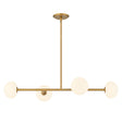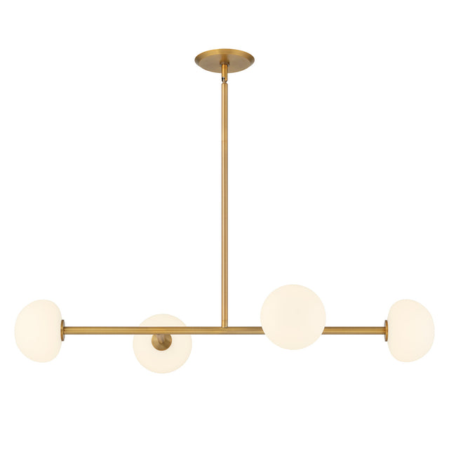 • Features four white opal glass orbs extending from an aged brass linear bar, suspended by an elegant round canopy and matching down rods