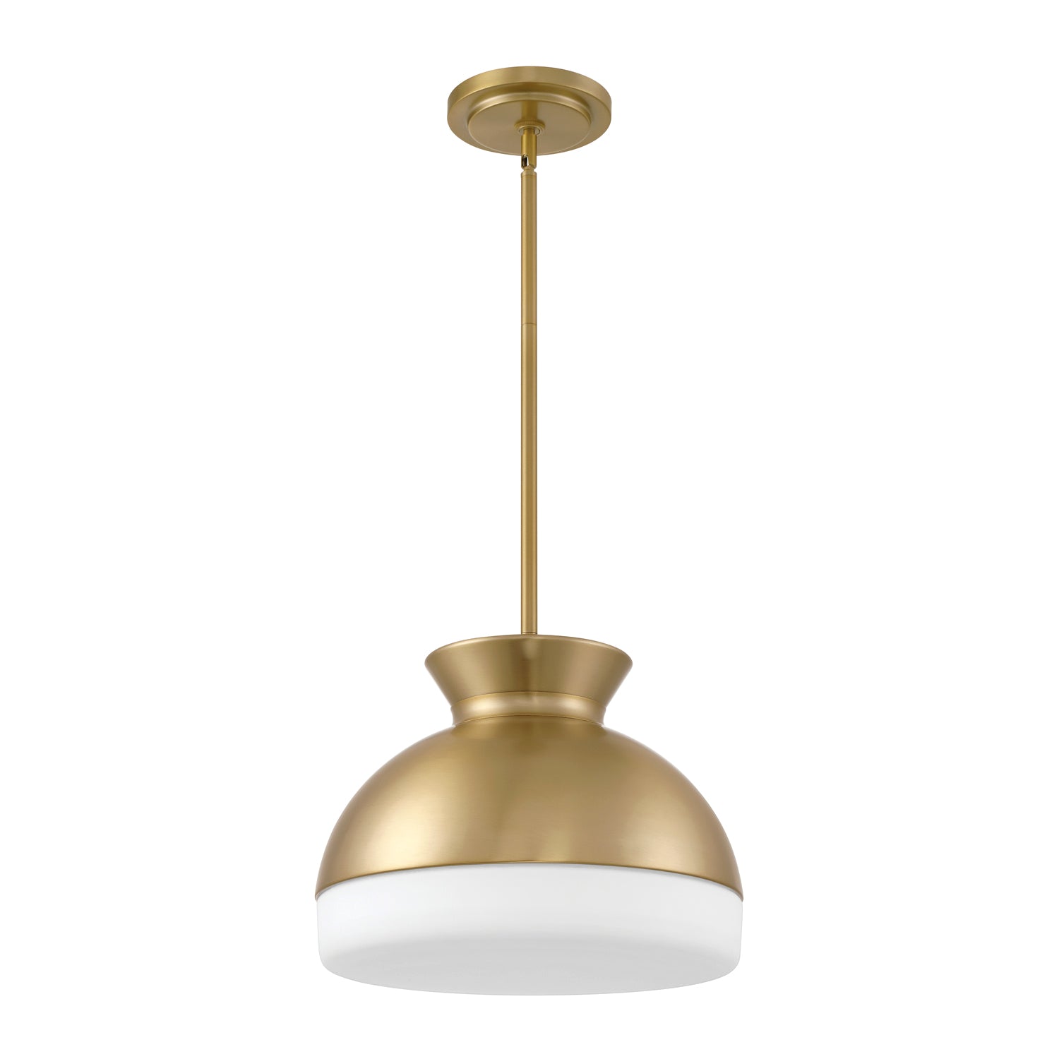 The Elody Pendant 15" features a warm and inviting design with a vibrant Brass metal dome and flat opal glass shade. This versatile fixture stands 12.25" tall and 15" in diameter, making it a perfect statement piece for dining areas, kitchens, or entryways. The mid-century modern inspired silhouette brings a contemporary edge to various interior styles while providing even, downward illumination. The combination of the lustrous brass finish and clean lines adds a touch of elegance to your space without being overly ornate. Damp-rated for use in bathrooms, the Elody creates a sophisticated lighting solution for any room in your home.