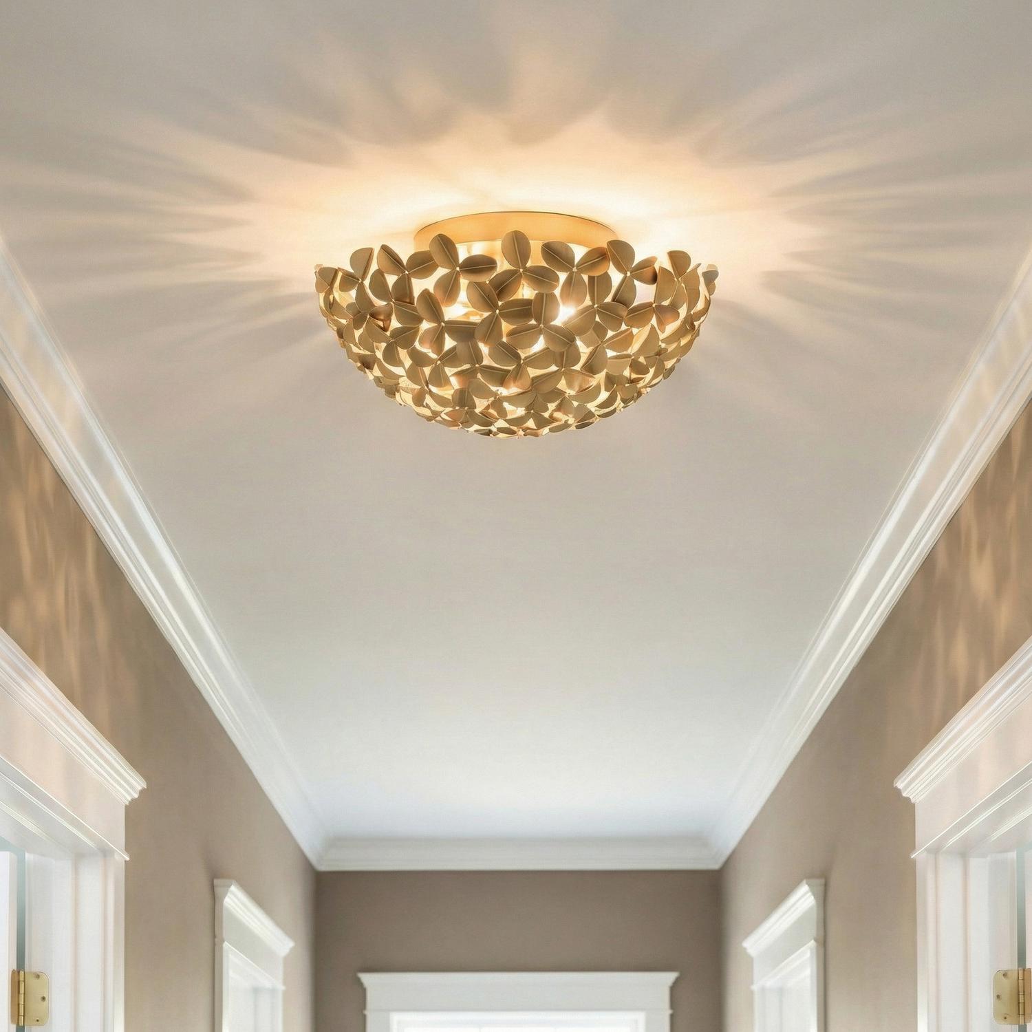 • Nature-inspired flush mount featuring a sculptural arrangement of layered metal leaves