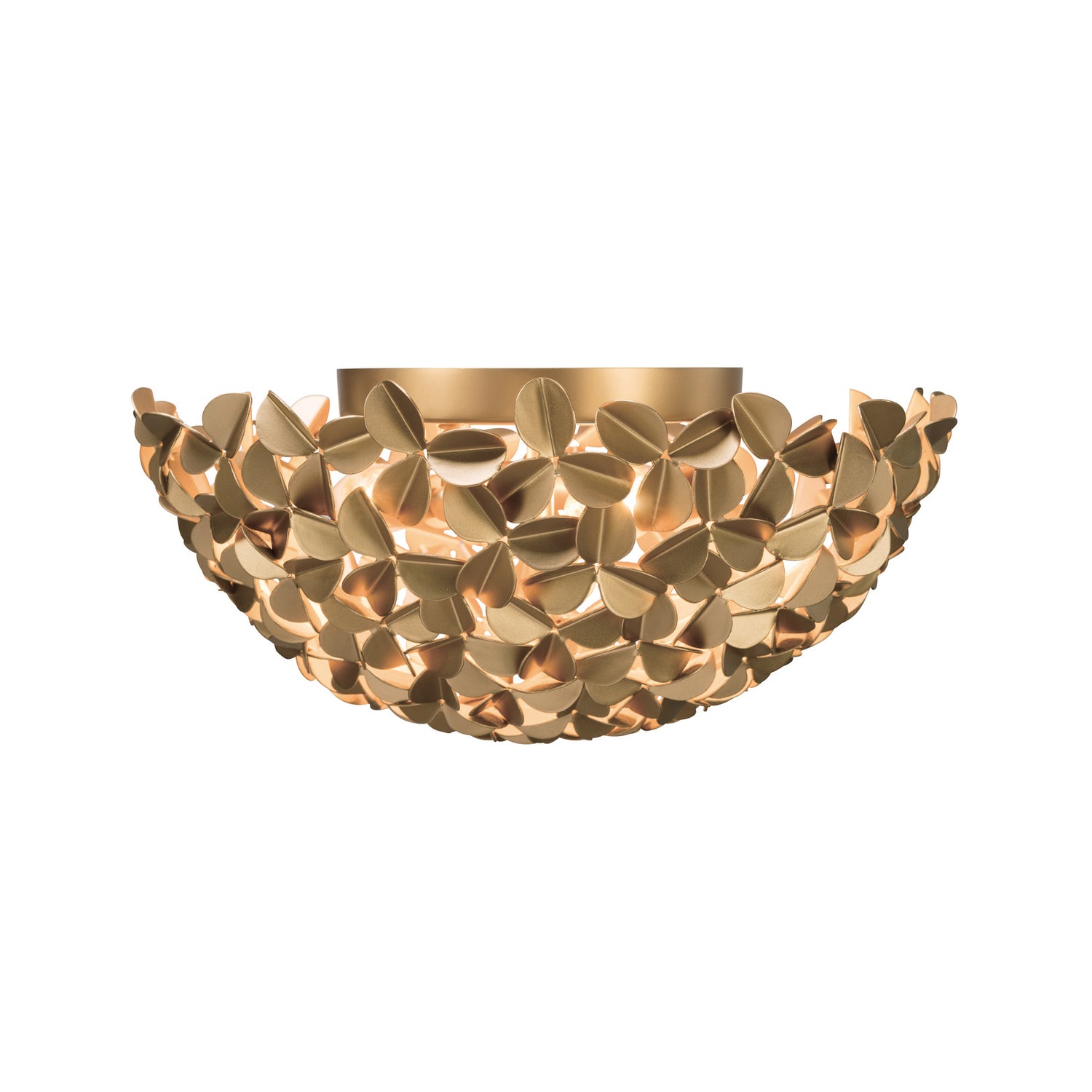 The Florence Flush Mount 16" is a classic transitional light that makes a breathtaking statement with its sculptural composition of layered metal leaves. The fixture features individual steel leaves that are masterfully arranged to create a shimmering, cloud-like silhouette that brings organic movement to any space. This glamorous flush mount is thoughtfully designed to provide stunning illumination, creating dimension and artistry through a play of light and shadow. With its UL damp rating, it offers both exceptional visual interest and versatile appeal in various indoor environments. The opulent Soft Brass finish enhances the delicate botanical details, delivering enduring style and a perfect blend of artistic elegance and modern charm.