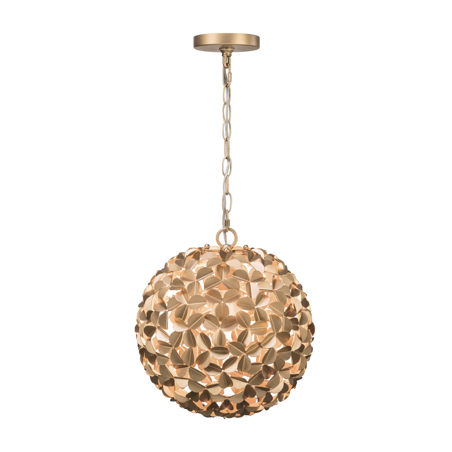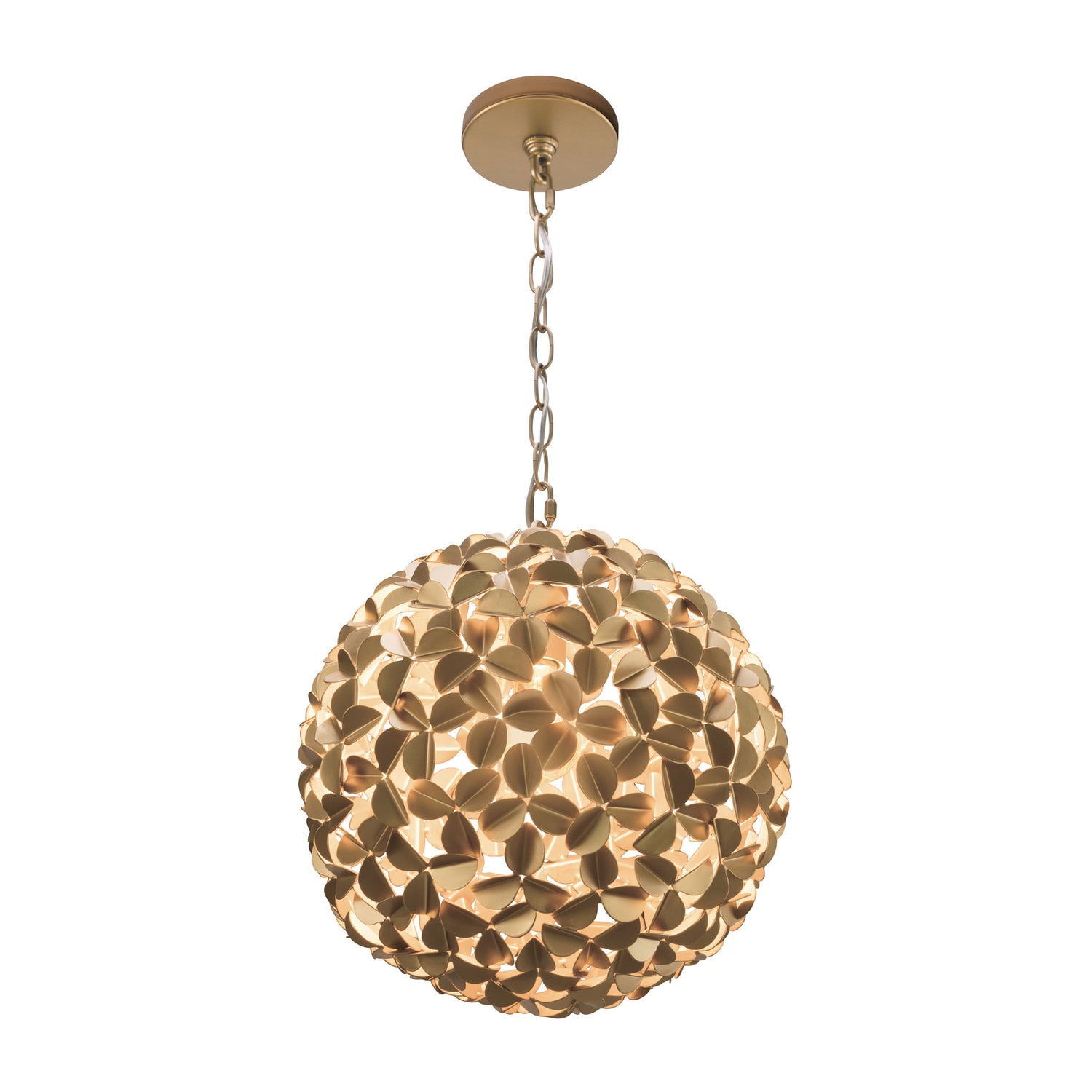 • Classic transitional pendant featuring a sculptural globe composition of layered metal leaves