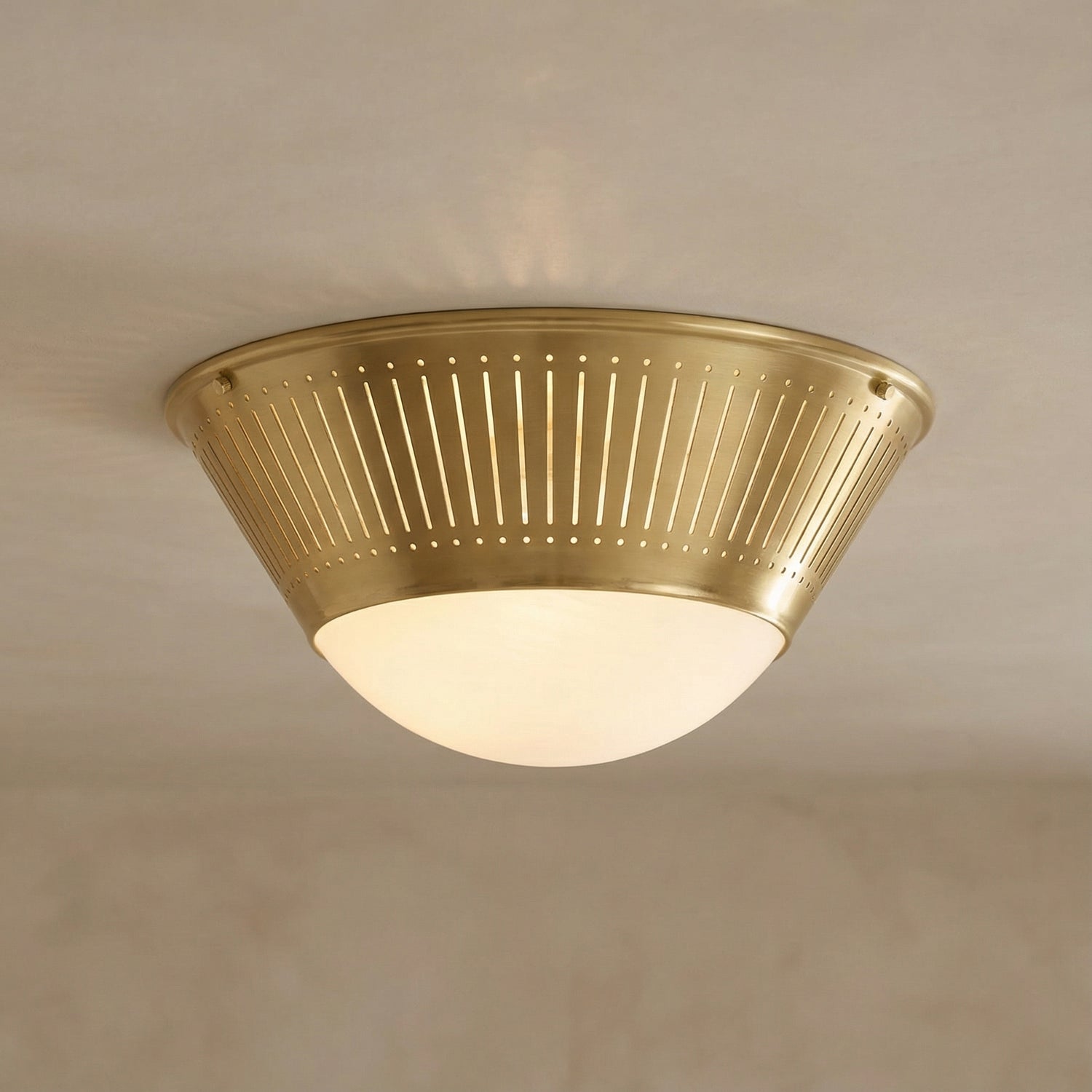 The Shirley Flush Mount 14" is a modern ceiling light that makes a sophisticated impression with its unique, inverted dome silhouette. The fixture is defined by a wide, smoothly curved Art Glass shade that provides powerful, yet soft, ambient illumination. This flush mount light fixture is thoughtfully designed for low ceilings, making it an ideal choice for a hallway, bedroom, or bathroom. With its UL damp rating, it offers both functional beauty and versatile appeal. The rich Aged Brass finish anchors the light, delivering enduring style and a perfect blend of elegance and simplicity.
