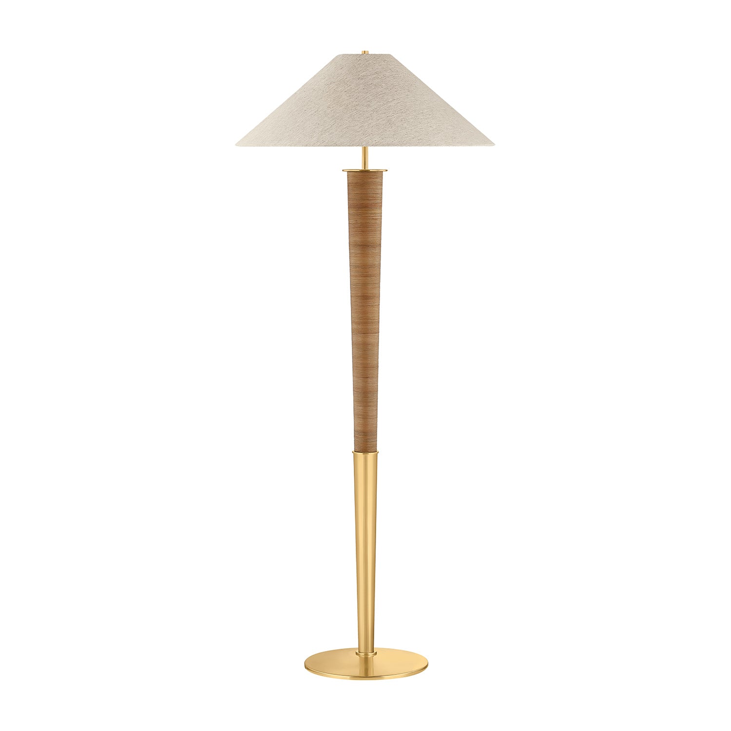 • Arcadia features a large-scale floor lamp with a natural linen shade and rattan-wrapped Aged Brass base