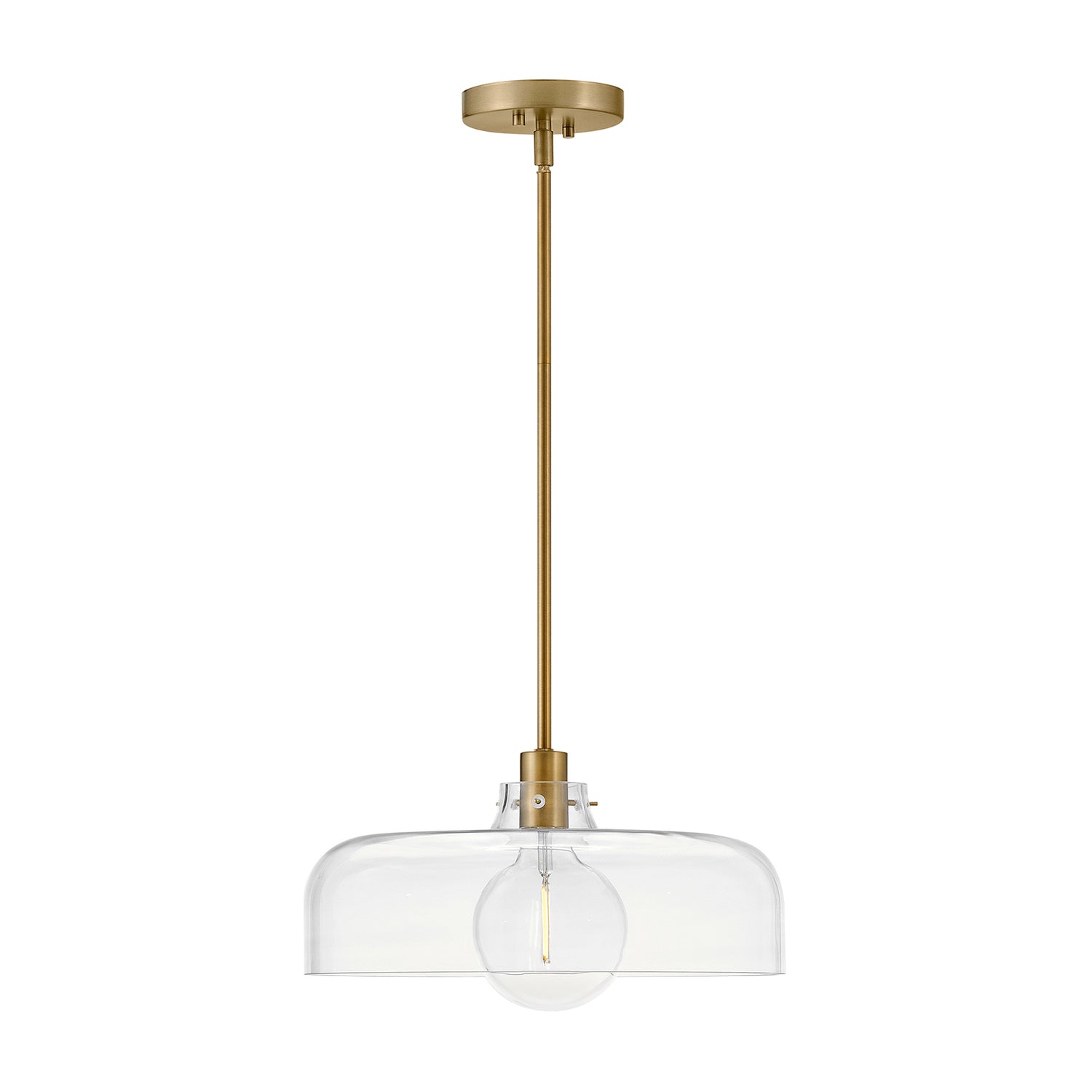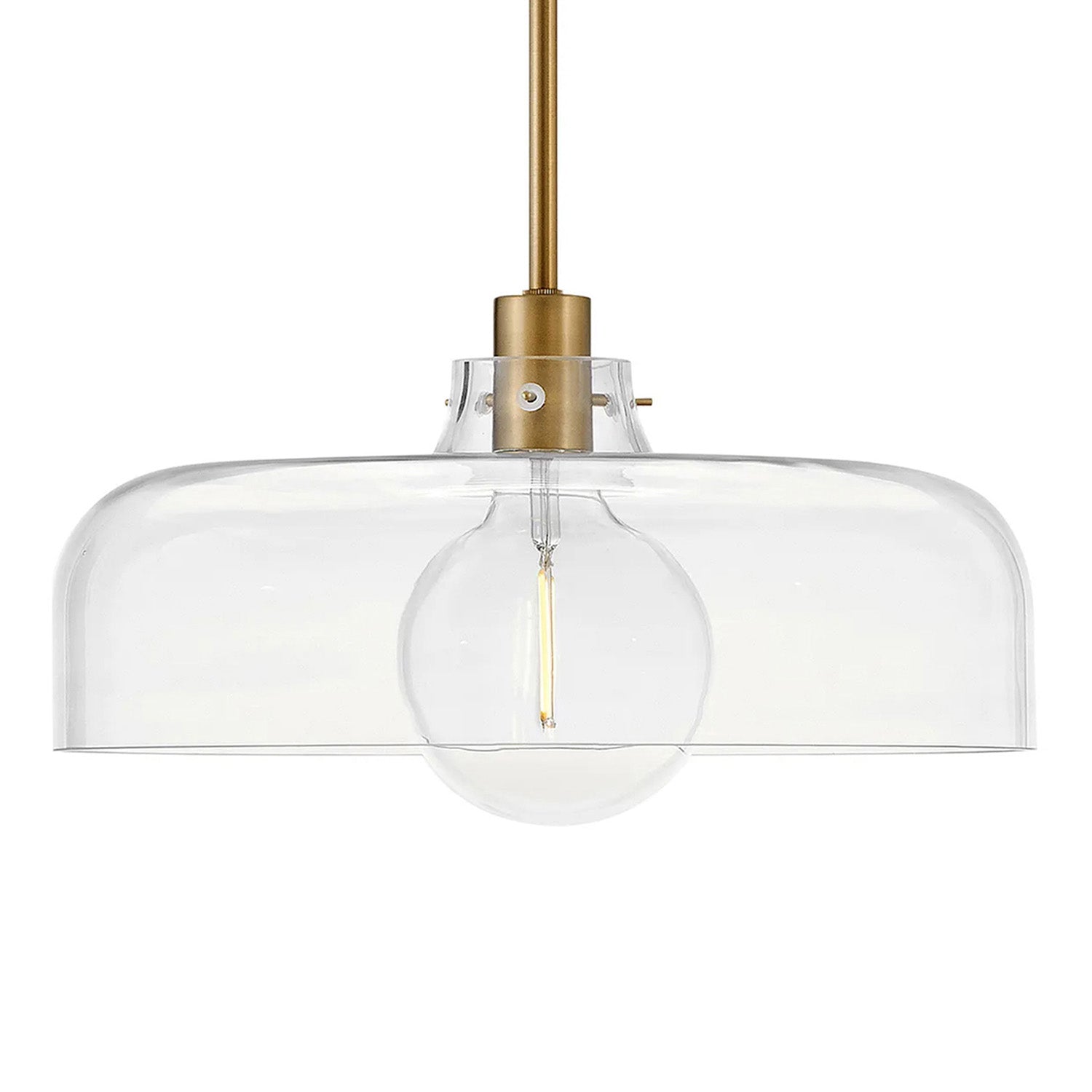 The Alder Pendant 15" makes a sophisticated statement, combining classic elegance with industrial simplicity. The fixture features a wide, domed Clear Glass shade and exposed decorative hardware, creating a simple, elegant form that anchors the space. This pendant is thoughtfully designed to provide brilliant, focused illumination, making it an ideal choice for a kitchen island, dining nook, or hallway. With its ETL dry rating and sloped ceiling compatibility, it offers both functional beauty and versatile appeal. The warm Satin Brass finish enhances the brilliance of the clear glass, resulting in a look of enduring style and timeless elegance. This striking collection delivers enduring style and a perfect blend of elegance and simplicity.