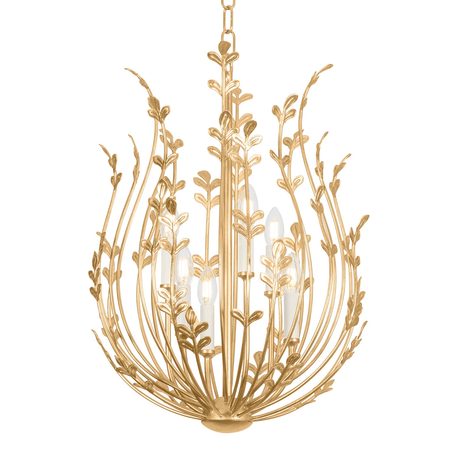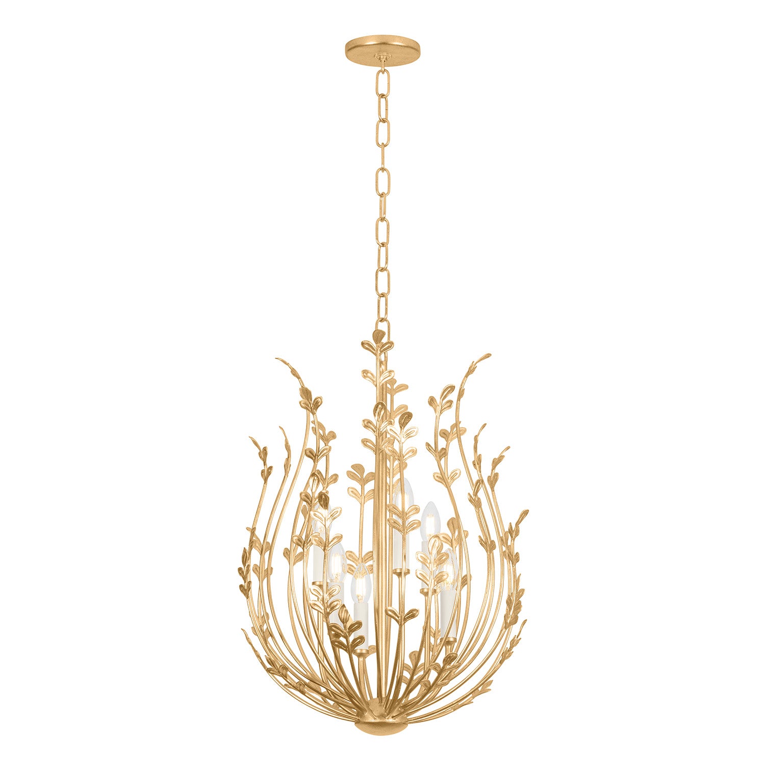 The Annelise Chandelier 20" is a modern artistic chandelier that makes a sophisticated impression with its vibrant, botanical silhouette and French-inspired design. The fixture is defined by numerous delicate, sculpted metal leaves that curve upward, creating a distinctive, organic 'bloom' surrounding the light sources. This chandelier is thoughtfully scaled to provide a generous, bright, warm, multi-directional glow, making it an ideal focal point for a grand living room or large entryway. With its UL damp rating, it offers exceptional visual interest and practical functionality. The opulent Gold Leaf finish provides a luminous, antique warmth, delivering enduring style and a perfect blend of elegance and simplicity.