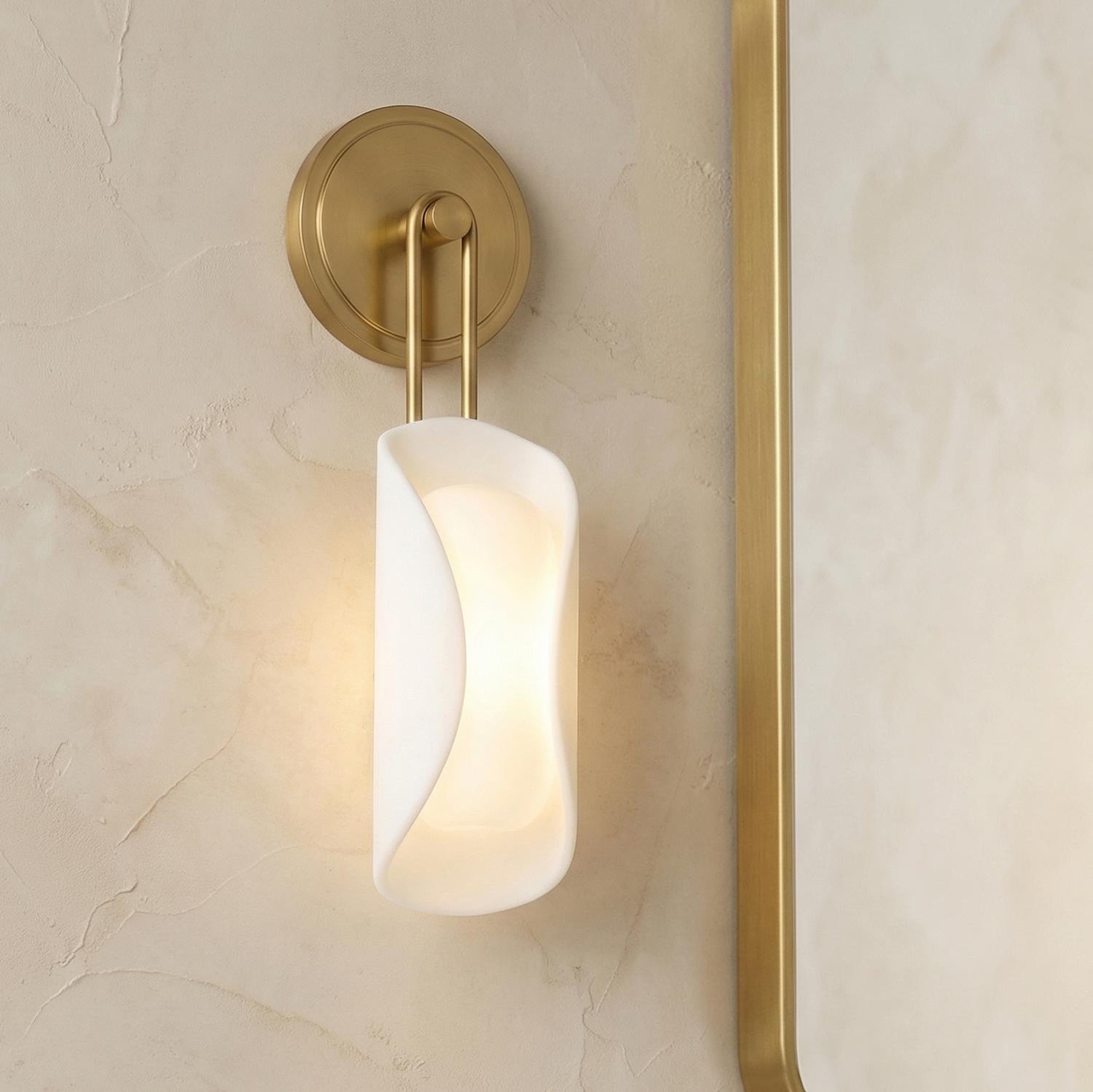 • Arlynn features an organic-modern wall sconce silhouette defined by a creamy 'folded' resin shade, opal glass diffuser, and an antique brass iron suspension
