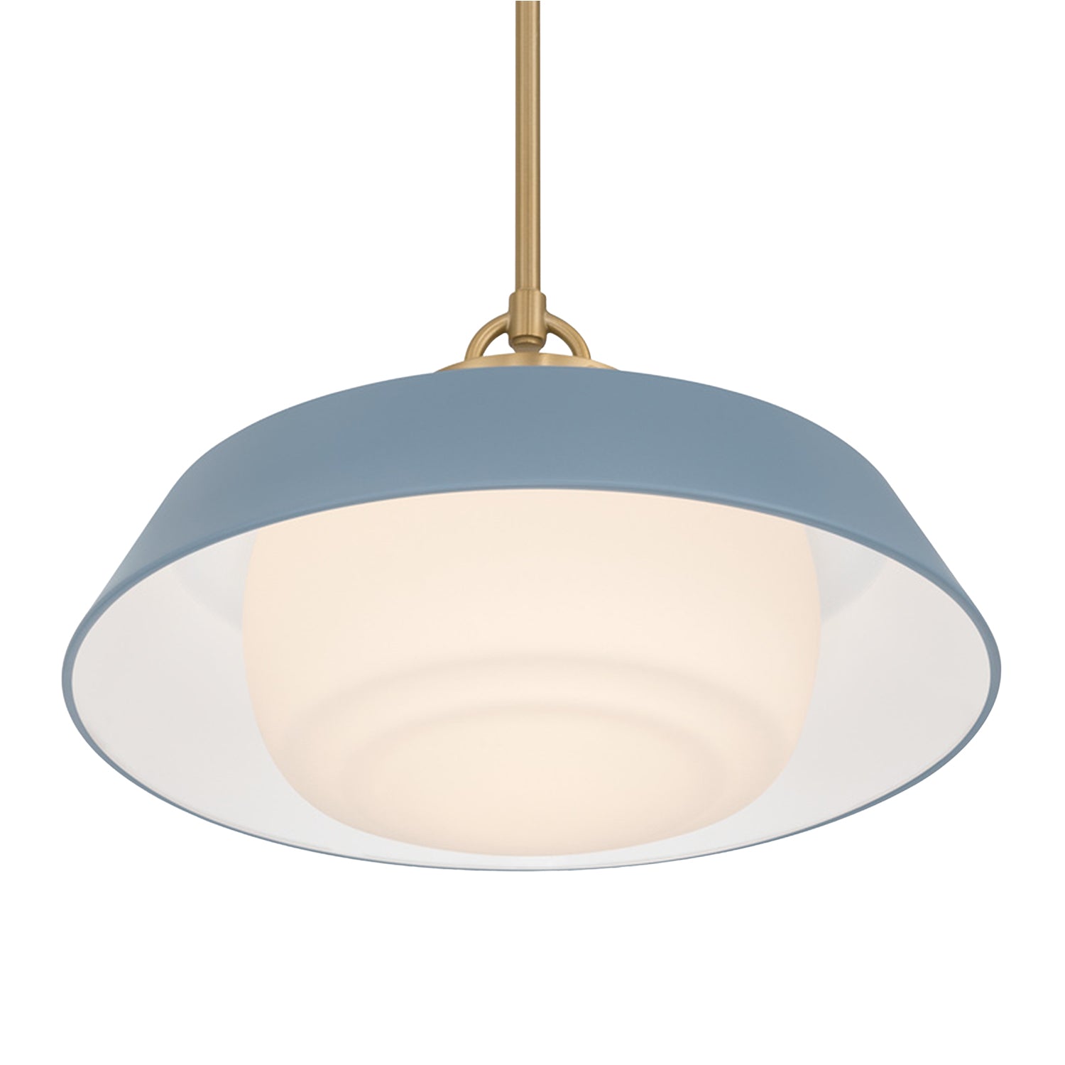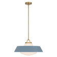 The Blaine Pendant 20" captures a mid-century-inspired aesthetic, defined by clean architectural lines and vibrant pops of color. This fixture pairs a brilliant white opal glass diffuser with a colorful steel shade and warm brass accents, creating a two-toned finish that brings a sense of refined character to any interior. The bold French Blue finish offers a refreshing and sophisticated contrast to the metallic details, making it an ideal choice for elevating kitchens, dining areas, or creative studios with a cheerful yet modern presence.