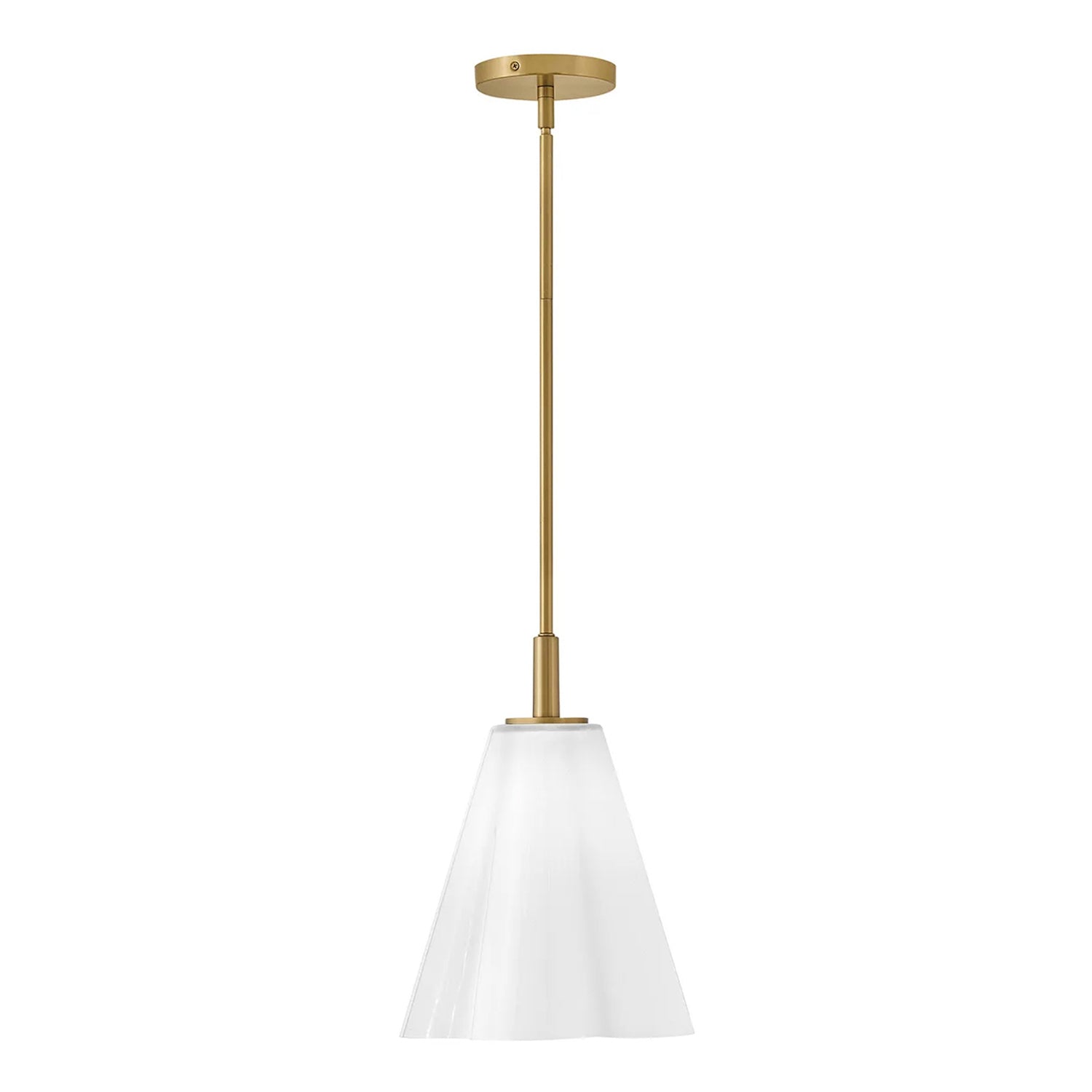 The Connie Pendant 11" makes a graceful statement with its vintage-inspired design and beautifully sculpted opal glass shade. The unique, scalloped opal glass shade is the focal point, designed to provide soft, elegant illumination that diffuses evenly across the space. This pendant is thoughtfully designed to provide focused, ambient light, making it an ideal choice for a dining nook or entryway. With its ETL dry rating and sloped ceiling compatibility, it offers both functional beauty and versatile appeal. The warm Rustic Brass finish enhances the soft texture of the glass, resulting in a refined and timeless look. This striking collection delivers enduring style and a perfect blend of elegance and simplicity.