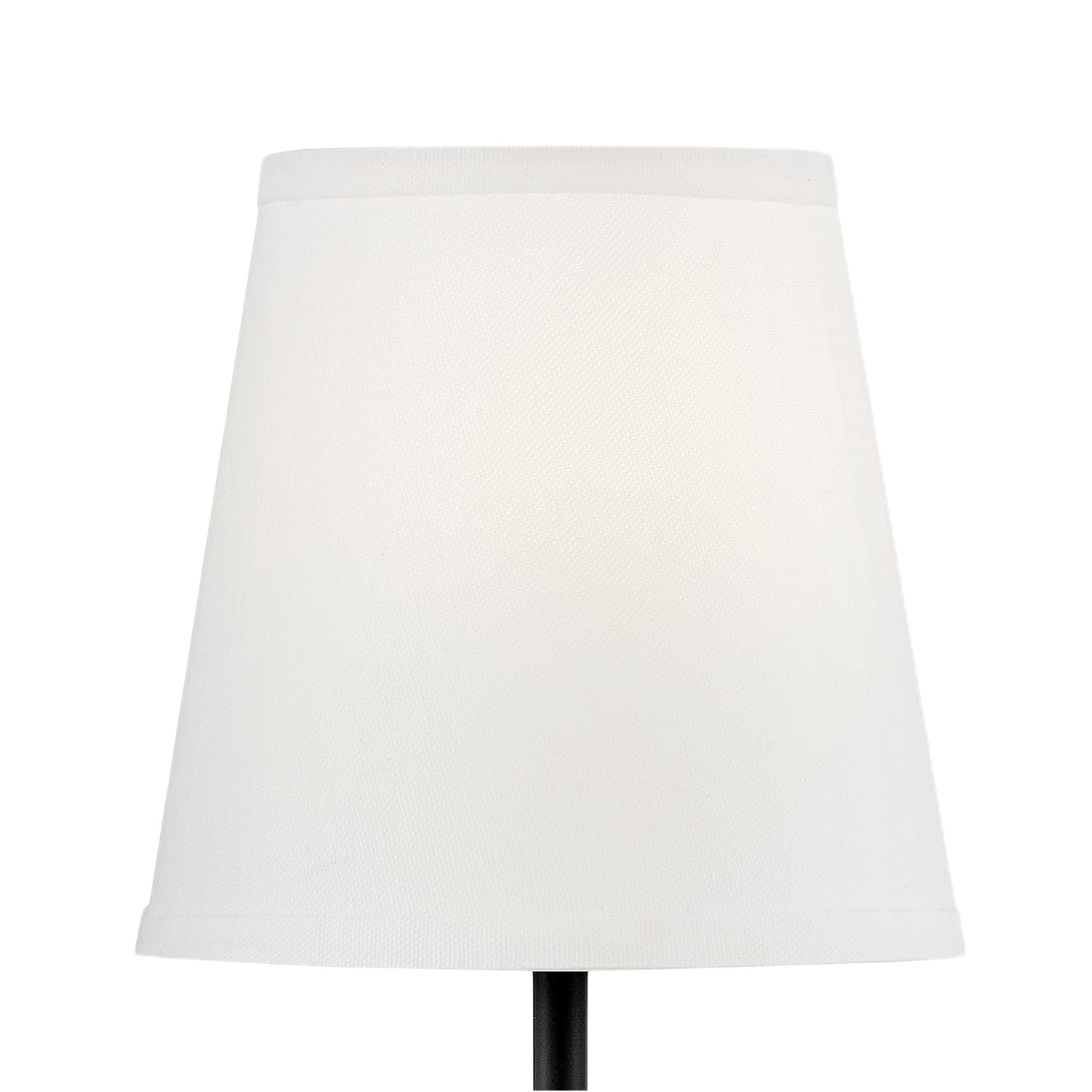 • Tapered white linen shade provides soft, diffused illumination, beautifully contrasted by the sleek black frame